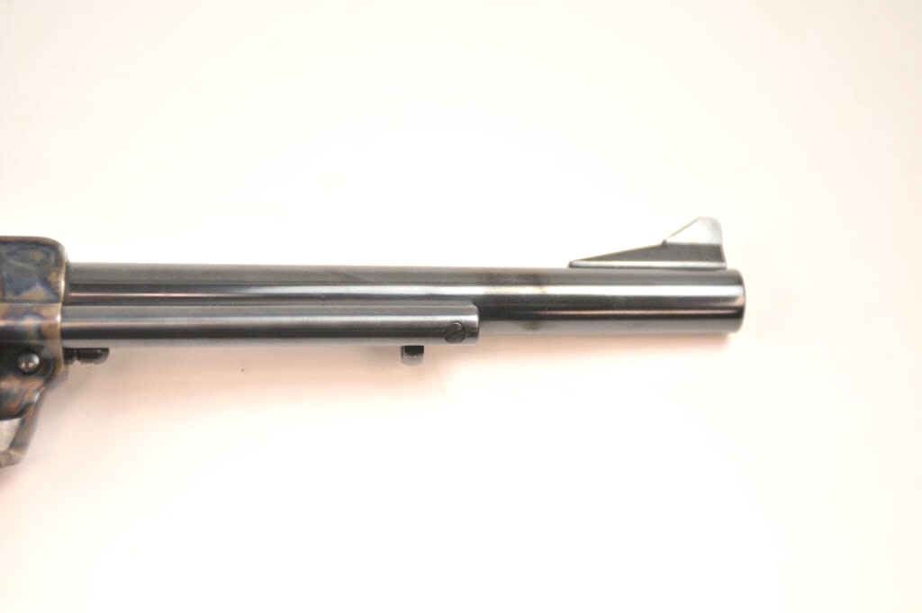 Colt SAA New Frontier revolver, .45 Colt caliber, Serial #04746NF. The pistol is as new in the factory cardboard box with a 7 ½” barrel. The pistol retains approximately 98-99% of the original blue finish with light handling marks. The frame is magnificently case hardened with vivid colors. The smooth Ivory grips are in excellent condition. The bore is good, the action is crisp and the markings are sharp. The box contains theoriginal Colt instruction manual. These New Frontier pistols are great shooters which are long out of production, like this example circa 1964. Est.: $1,250-$1,750. (C+R/PPT).