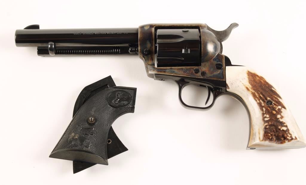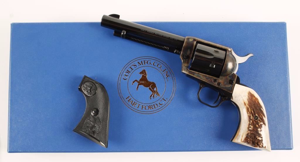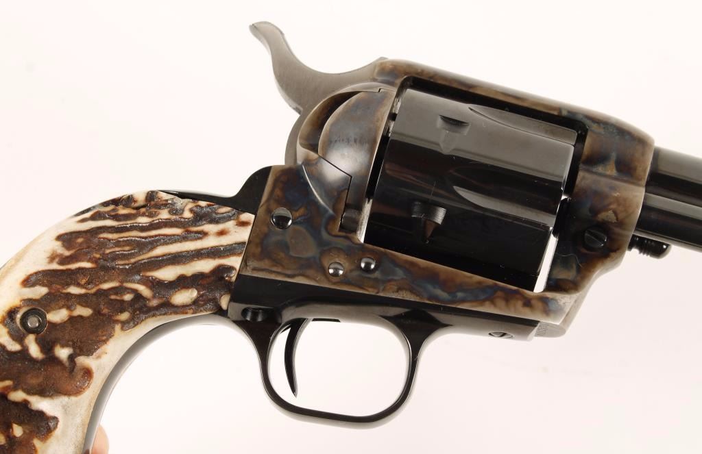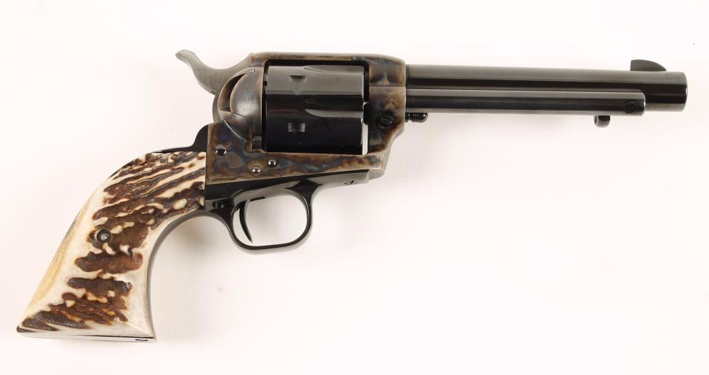 Blued and case-colored single-action revolver with a 5-1/2" barrel, fixed sights, stag grips, original hard rubber grips, box numbered to the gun, lock and documents. Metal finish shows no blemishes. Both sets of grips are impeccable. Bore is mirror bright and the chambers are immaculate. There is no drag line. Condition is excellent. The end flap of the packing sleeve is 2 numbers off the number of the gun but the sticker on the side of the box matches the gun. *Modern Firearm*
