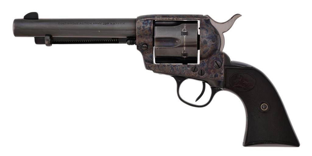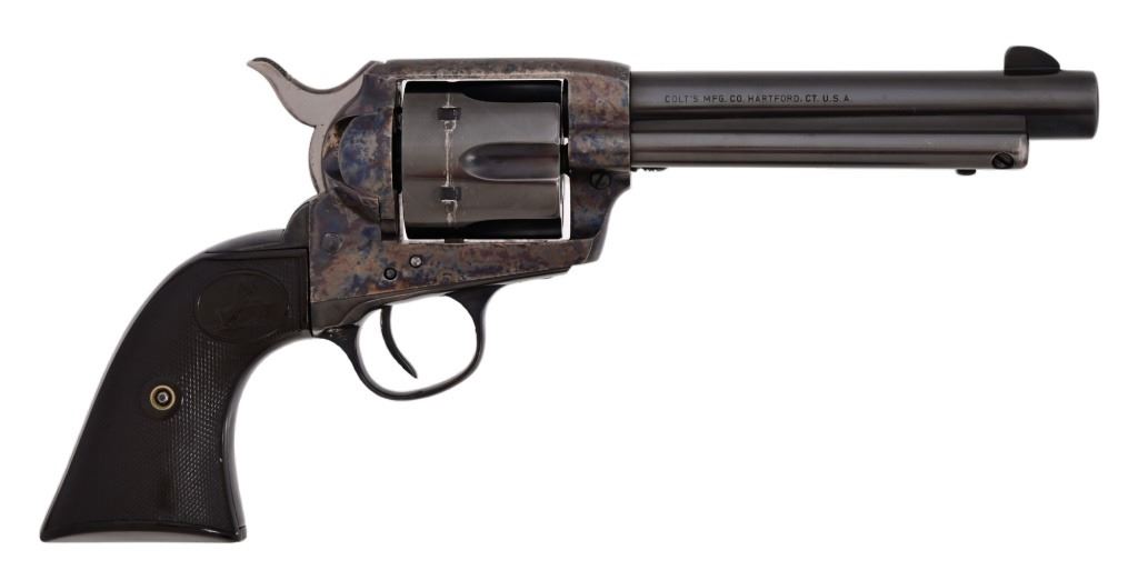 S/N 328614. Barrel measures 5.5", Rampant colt checkered grips, case hardened frame over blue finish barrel. Strong action and bore.