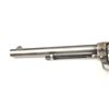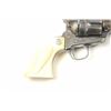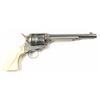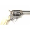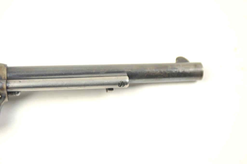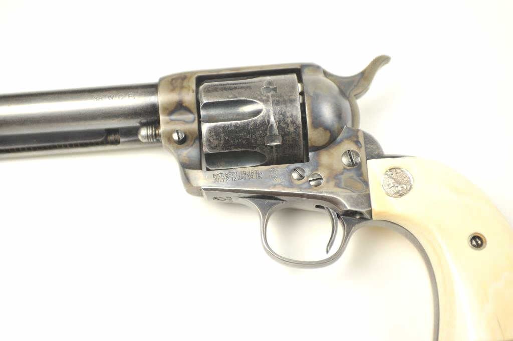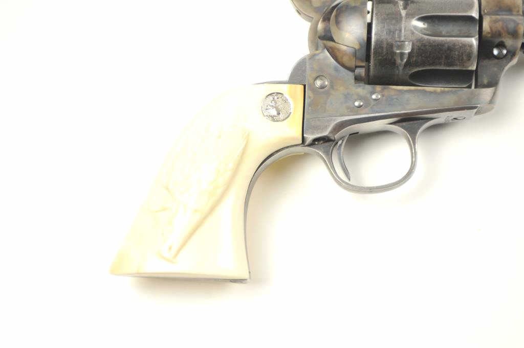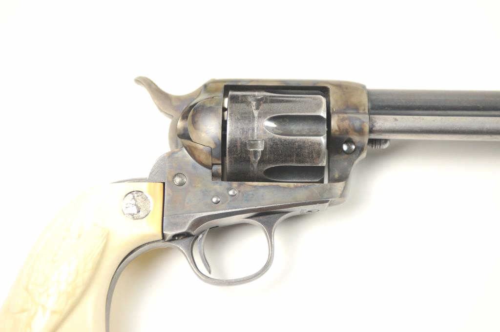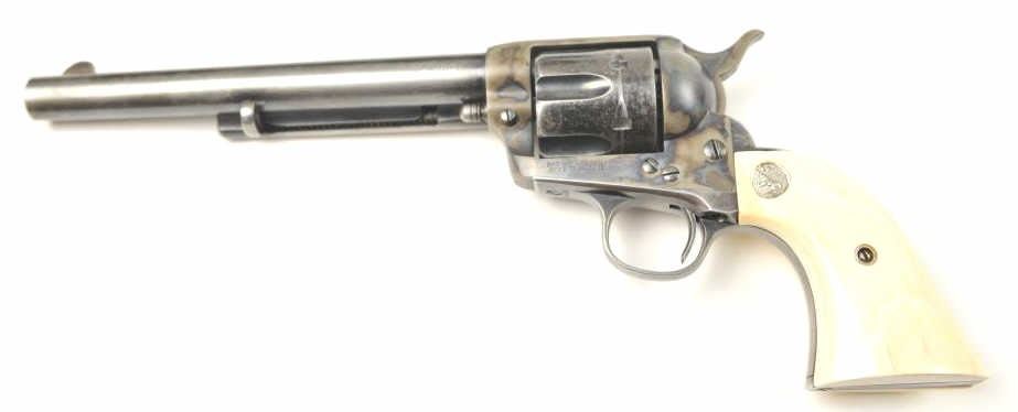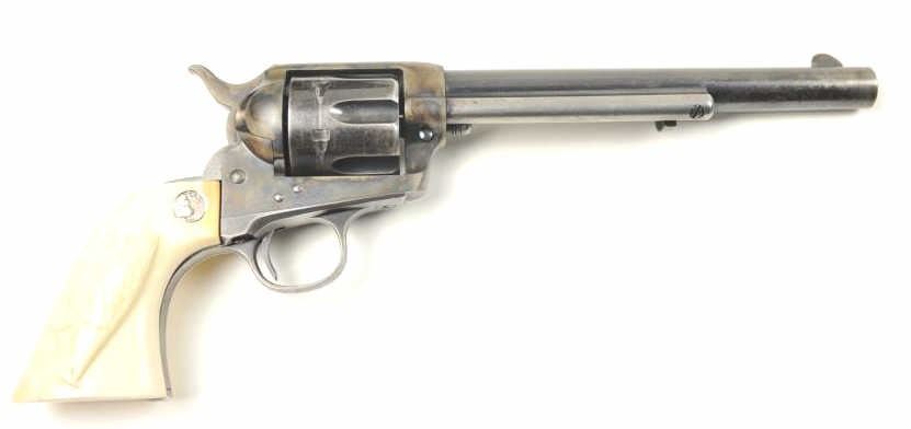 Colt SAA Revolver in .38-40 caliber with a 7 barrel, blue and case hardened finish, and carved medallion grips, S/N 255932. The revolver shows most of the original and colorful case hardening on the frame and hammer. The barrel and ejector rod housing along with hi points show holster wear on the left from carry on the right side. The straps show 30%-50% blue and losses from handling. The cylinder shows 50%-70% blue with deep index line and losses of finish at front from firing. The grips are not a perfect fit and from another Colt showing “War Eagle”. The grips are very good with minor cracks and yellowing. Front sight reduced slightly. The action locks up tight and bore bright. Case colors are 80%-90% and with great rainbows remaining. Factory letter states .38/40 caliber, 7 ½” barrel, blue finish, stocks not listed, Shipped to Browning bros, Ogden, Utah, July 20, 1904, 2 guns in shipment.(C& R/PPT) Est.: $2000-$4000