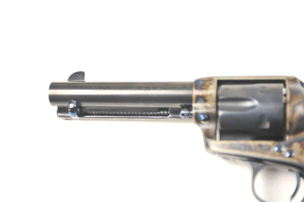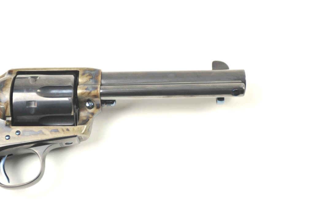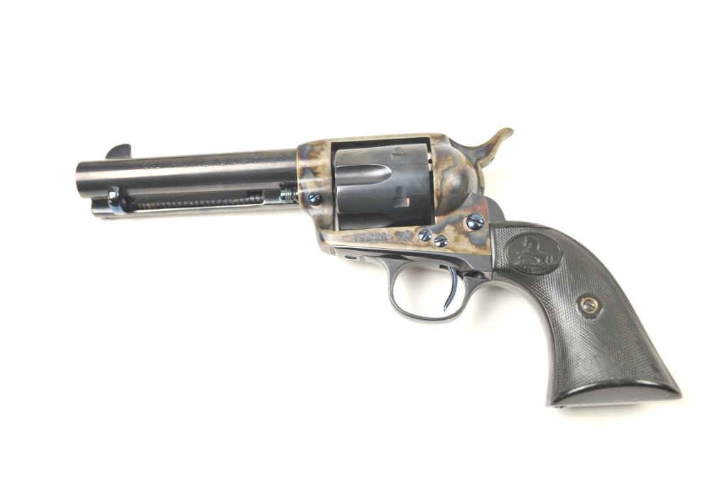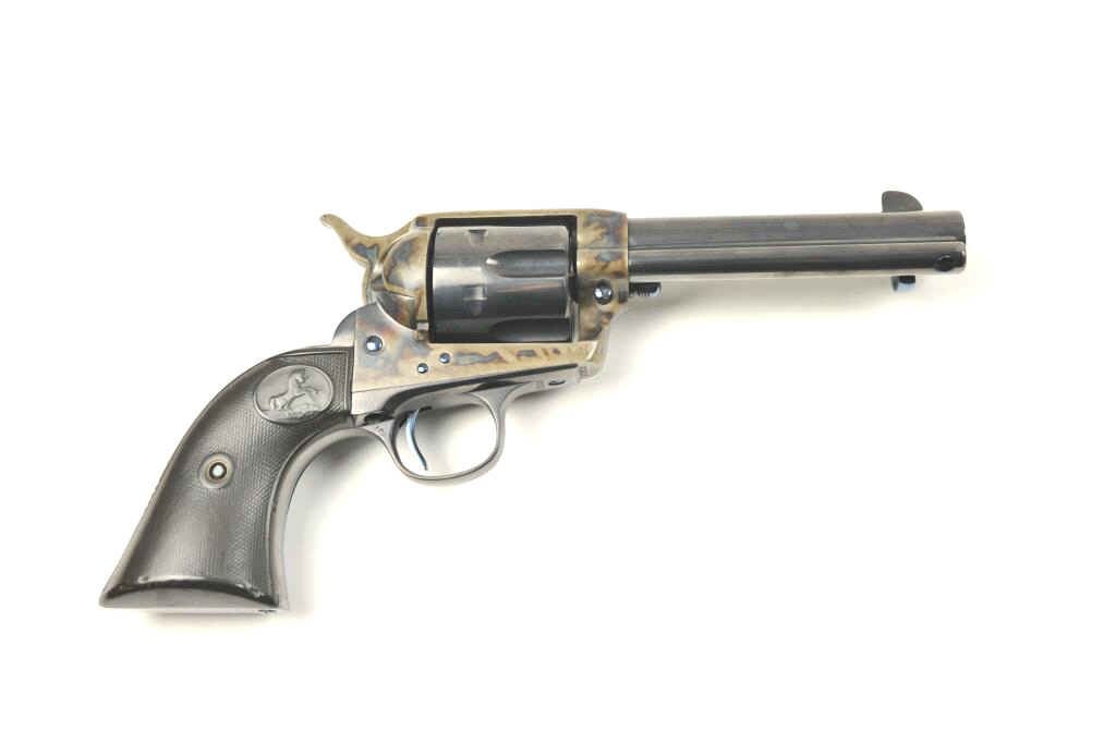 Colt SAA Revolver in .44-40 caliber with a 4 ¾” barrel, professionally refinished, and hard rubber grips, S/N 271101 made 1905. The right trigger guard bow shows an indecipherable mark possibly for factory return. The revolver shows 98%-99% high quality blue and excellent case hardening. The grips fit impeccably but worn almost smooth. Crisp markings, sound action and bright bore with fully readable Colt Frontier Six Shooter . Front sight is its full height. Factory letter states .44/40 caliber, 4 ¾” barrel, blue finish, stocks not listed, Shipped to: Simmons Hardware Company, St. Louis, Missouri, December 19, 1905, 10 guns in shipment(C& R/PPT) Est.: $1750-$3500