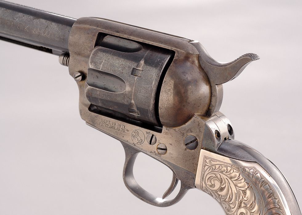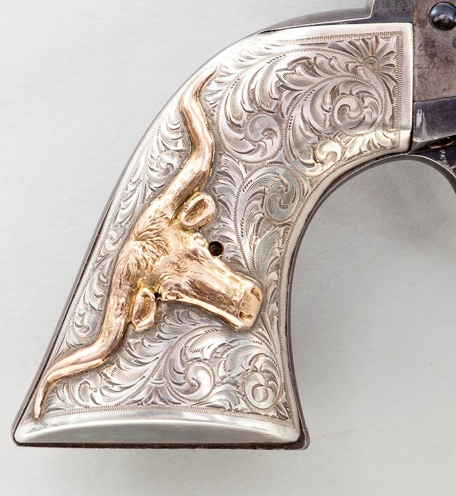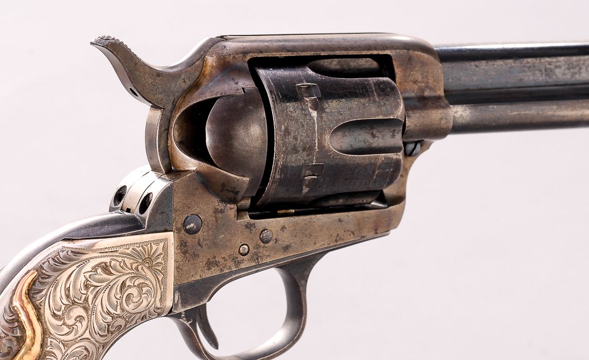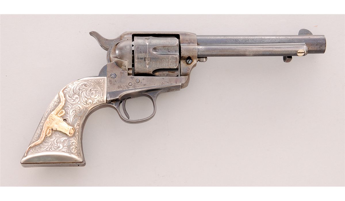 Antique Colt Single Action Army Revolver, with Pre-War Bohlin Grips, #173450, .44-40 cal., 5-1/2'' barrel, blue with case hardened finish, foliate and floral engraved silver Bohlin grips with applied 10K long-horn steerhead to right panel. Interior of grips marked ''Bohlinmade/Calif./Hollywood''; right panel additionally marked ''Sterling/10-K''. This revolver was originally shipped to G.M. Williams Co., New London, Conn., Oct 13, 1897, in a 24-gun shipment. With factory letter verifying all features, except grips were originally listed as rubber. Barrel is roll marked ''Colt Frontier Six Shooter'', with two-line three-date patent markings to left side of frame. Later purchased and embellished for Mr. Lewis G. Carlisle (1914-1982). A nephew of Allen Pinkerton and pilot for the world-champion LA Dodgers, Carlisle was a Yale graduate who excelled as a member of their rowing team in 1933. Mr. Carlisle was the son of Jay F. Carlisle, a NY stockbroker. Condition is fine. Barrel and ejector rod housing retain approx. 95% original blue. Cylinder with 85%-90% thinning blue. Frame retains approx. 70% vivid case colors with thinning and silvering. Backstrap and triggerguard show 85%-90% blue. Grips remain in excellent condition showing only light wear. Grip screw slots with minor aberrations. Action is good and tight, bore is bright. Est.: $7,500-$10,000. (Antique)