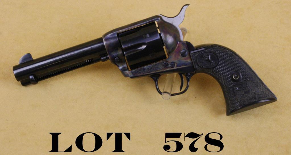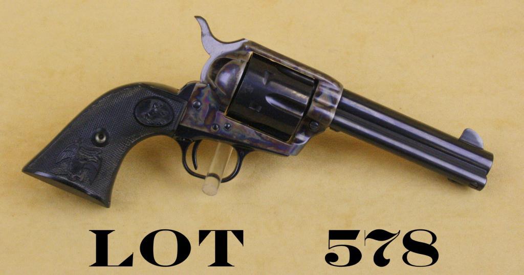 Colt SAA Third Generation revolver, .45 cal., 4-3/4” barrel, blue and case hardened finish, checkered eagle black hard rubber grips, #SA25611. This gun shows little use and retains approx. 99% original blue andcase hardened finish, excellent bore, action, markings and grips that show some dusty grime that is in the checkering and may clean; accompanied by an extra pair of plain ivory grips. Est.: $800-$1,600.