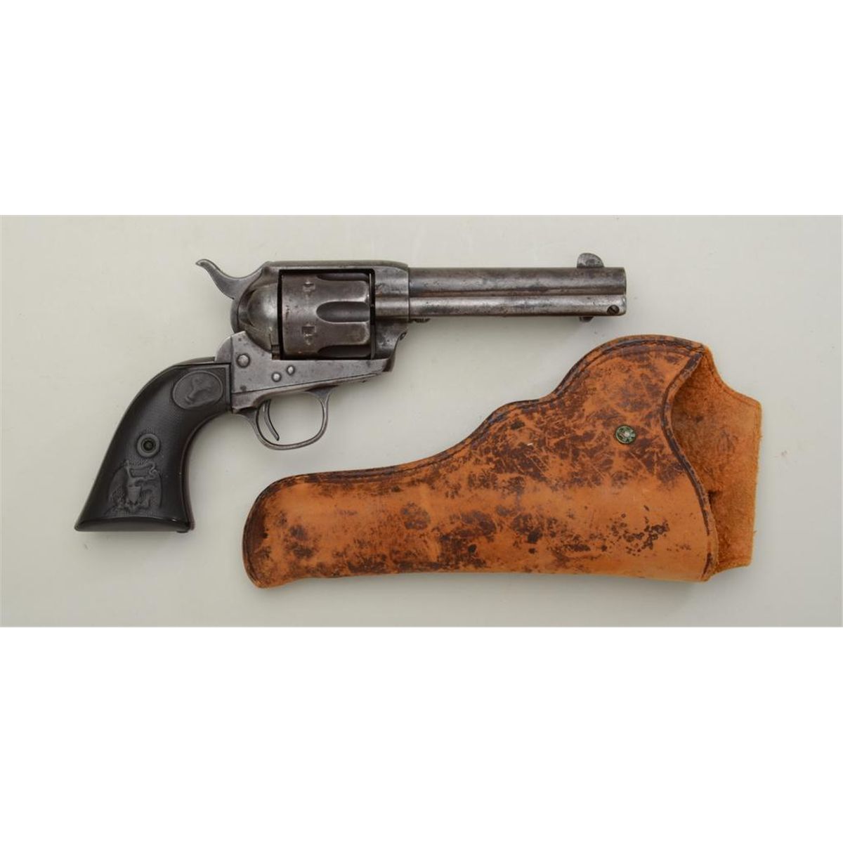 Colt SAA blackpowder revolver, .45 cal., 4-3/4” barrel, blue and case hardened finish, checkered eagle black hard rubber grips, #111401. This gun is in overall very good condition showing a grey patina on metalsurfaces with scattered spots of erosion and pin prick pitting, good bore, crisp action, good markings and classically worn but complete grips; accompanied by a brown leather holster that shows dryness and wearbut improvable with some TLC and Pecard’s treatment. Est.: $1,400-$2,800.