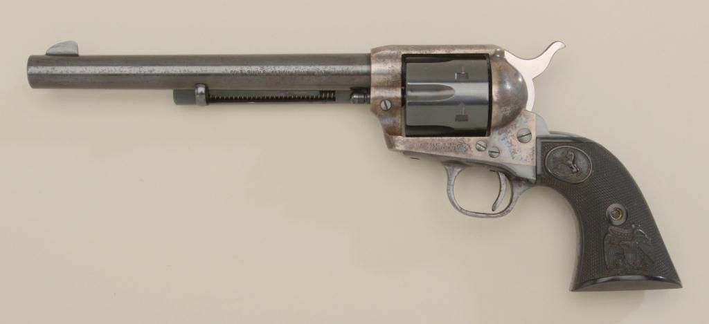 Colt SAA revolver, 2nd Generation, circa 1972, .357 Magnum cal., 7-1/2” barrel, blue and case hardened finish, checkered black hard rubber eagle grips, #61274SA. This gun is in overall very good condition showingconsiderable original blue and case colors; scattered spots of erosion and pin prick pitting over the left side of the barrel and frame from improper storage; fine bore, crisp action, sharp markings, very good to finegrips. Est.: $1,500-$2,250.