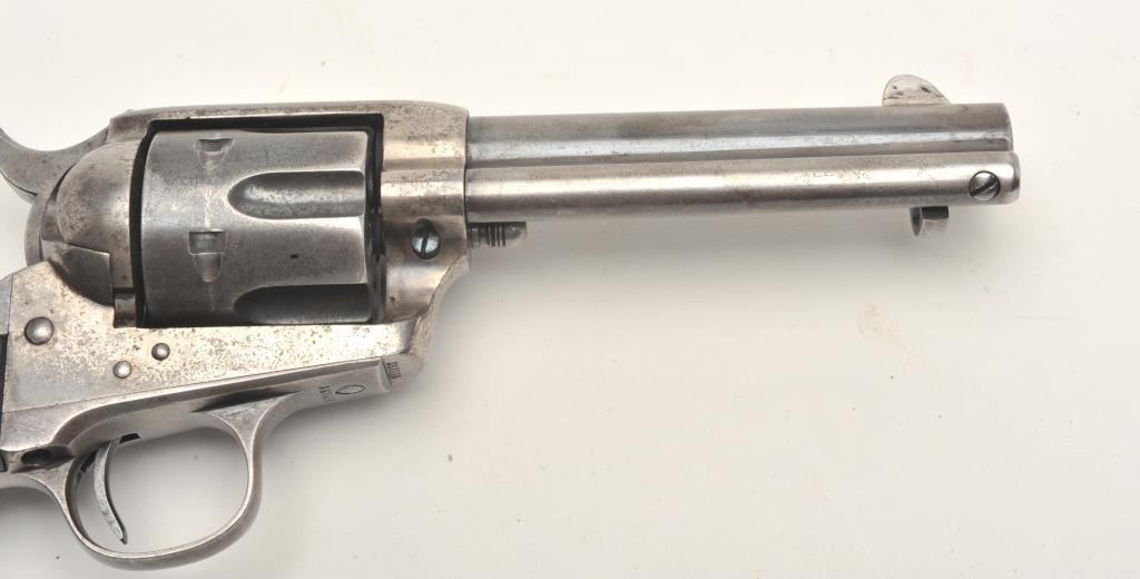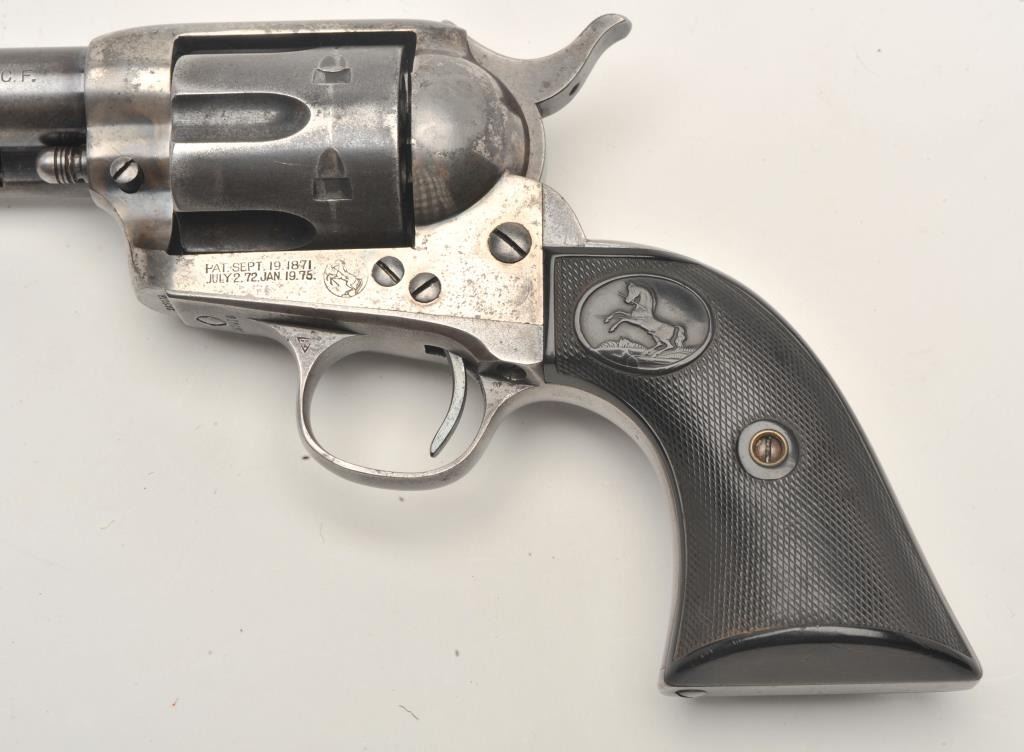 Colt SAA revolver, .32/20 caliber, 4.75” barrel, blued and case hardened finish, checkered hard rubber grips, S/N 263916, in overall very good + condition displaying traces of original blue and case colors inprotected areas, crisp action, very good bore, sharp markings and very good grips; A very good Colt factory letter accompanies this gun confirming features (stocks “Not Listed”) and importantly, sold to BiddlePurchg. Co., address unavailable with shipment to the Anaconda Copper Mining Co., Butte, MT. on February 17, 1905, two guns in shipment. (C&R/No PPT). Est.: $1,750-$3,500.