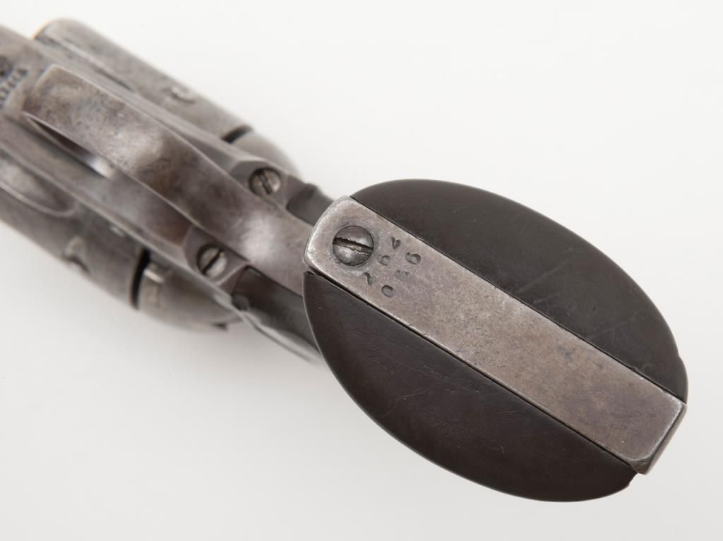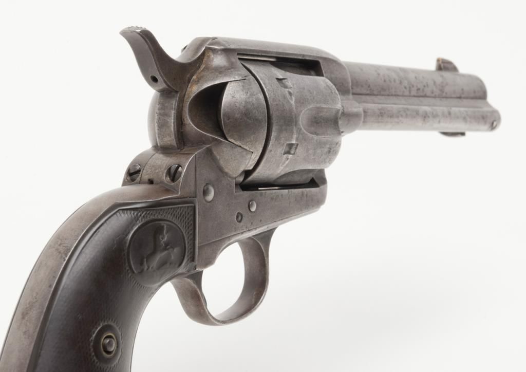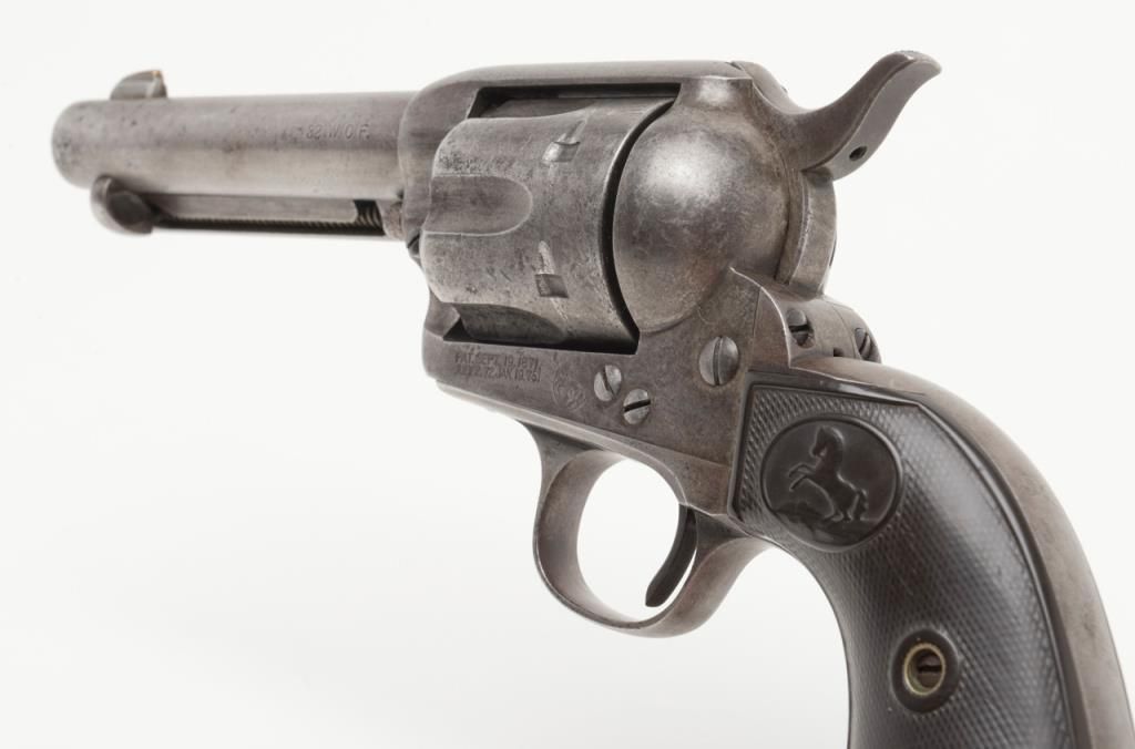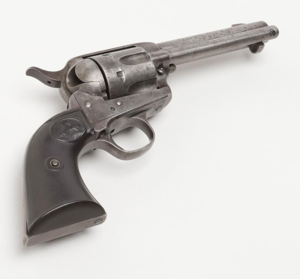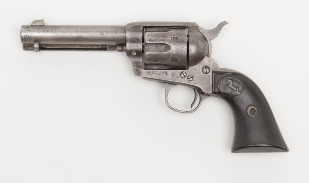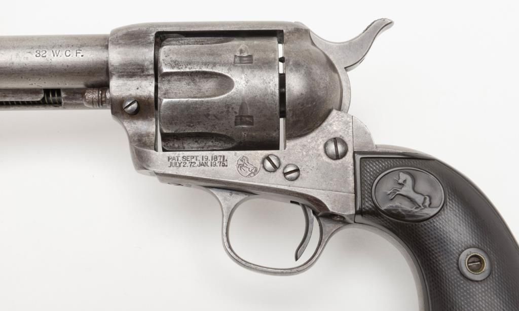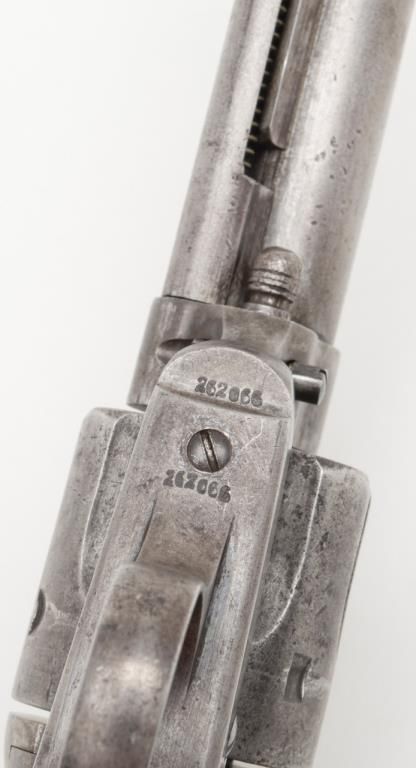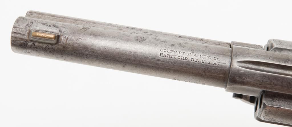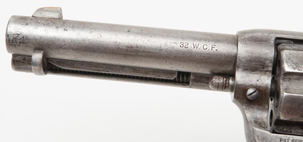 Colt SAA revolver, .32 W.C.F. cal., 4-3/4” barrel, blue and case hardened finish, checkered hard rubber grips, #262006 in overall good condition showing an old cleaning that is returning to a light grey patina with scattered areas of erosion, wear and pinprick pitting, crisp action, fair bore, good markings and worn but complete grips; front sight has been modified with a brass bead. Factory letter confirms features and indicates the weapon was shipped to Simmons Hardware Co., St.Louis, Mo. on January 10, 1905 in a shipment of 40 guns. Accompanying this lot is a signed letter, newspaper articles and a photo of the owner, Leonard A. Wright, stating that Wright was born in Albuquerque, NM in July 1887, that he came from a pioneer family from New Mexico and Texas, that he worked for some 60 years as a cowboy, rancher and periodic lawman. Leonard also reportedly witnessed the lynching of “Shotgun” Jim Miller, Joe Allen, BB Burrell and Jesse West at Ada, OK.In April 1909 for the murder of A.A. “Gus” Bobbitt. He additionally had previously be a member of the Booger Red’s Wild West show. In later years, Wright worked for the Phelps Dodge Mining Corp as a Security guard in Arizona before