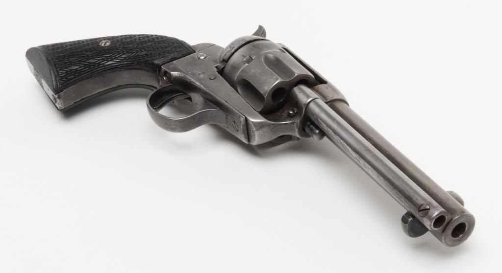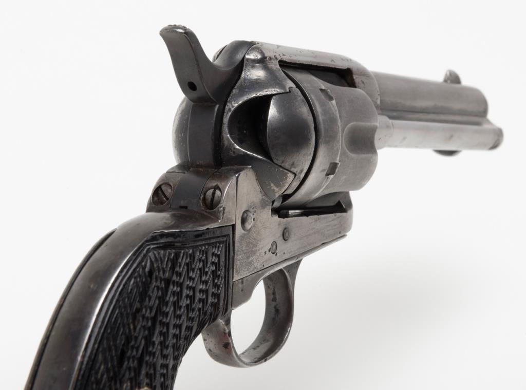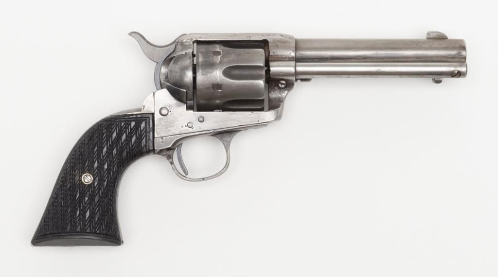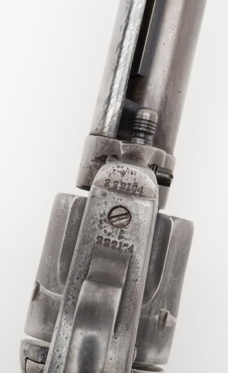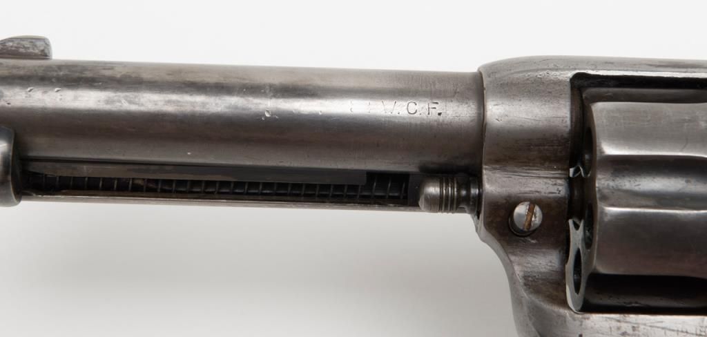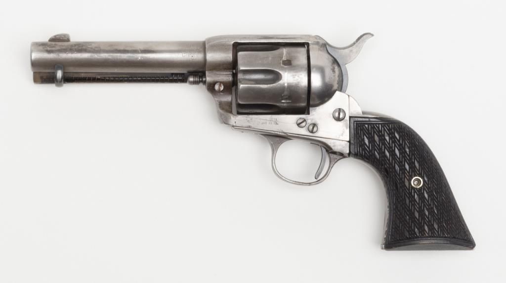 Colt SAA revolver, .32 W.C.F. cal., 4-3/4” barrel, blue and case hardened finish, checkered plastic grips, #222174 in overall fair to good condition showing an old cleaning with grey patina; some areas of pitting that have been heavily cleaned;good action, fair bore with some scattered pitting, light markings; backstrap number not visible; grips are hand checkered; gun is circa 1902. (C&R). Est.: $1,400-$2,800.