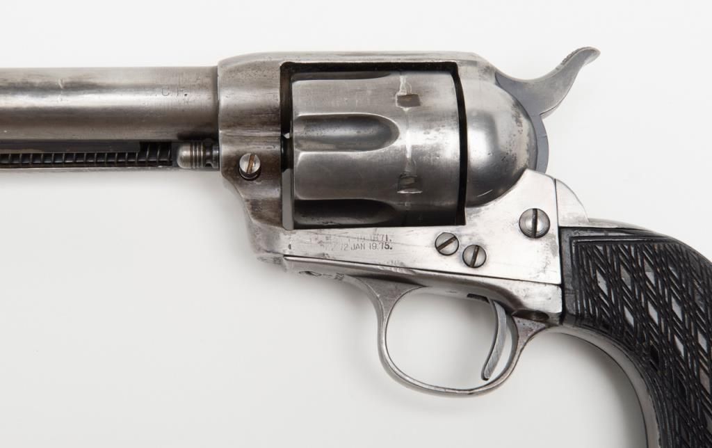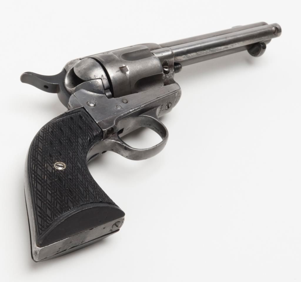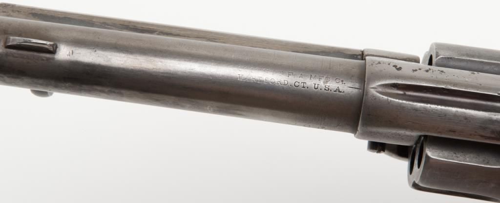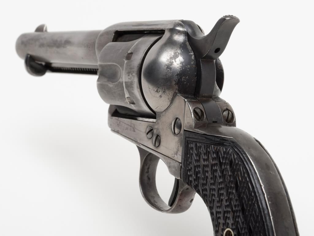 Colt SAA revolver, .32 W.C.F. cal., 4-3/4” barrel, blue and case hardened finish, checkered plastic grips, #222174 in overall fair to good condition showing an old cleaning with grey patina; some areas of pitting that have been heavily cleaned;good action, fair bore with some scattered pitting, light markings; backstrap number not visible; grips are hand checkered; gun is circa 1902. (C&R). Est.: $1,400-$2,800.