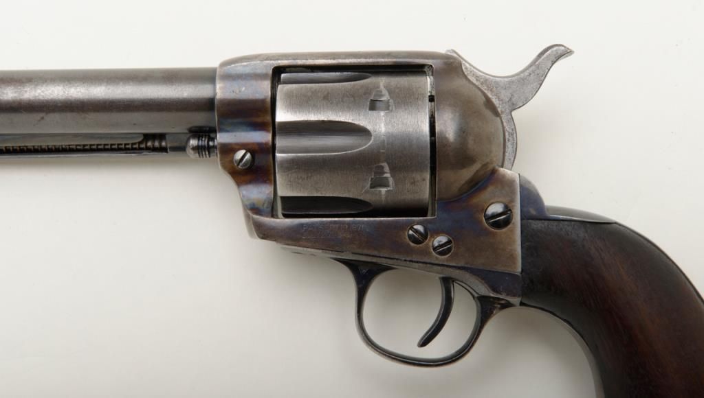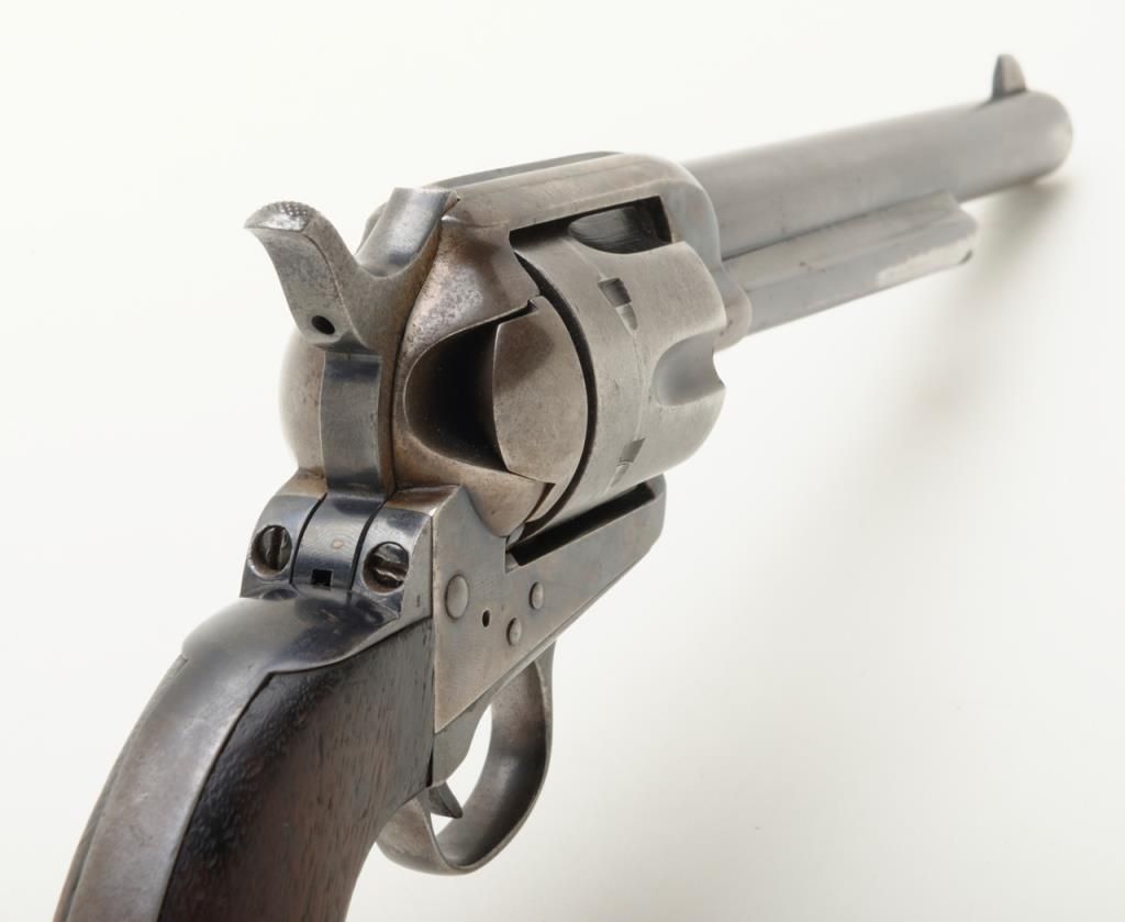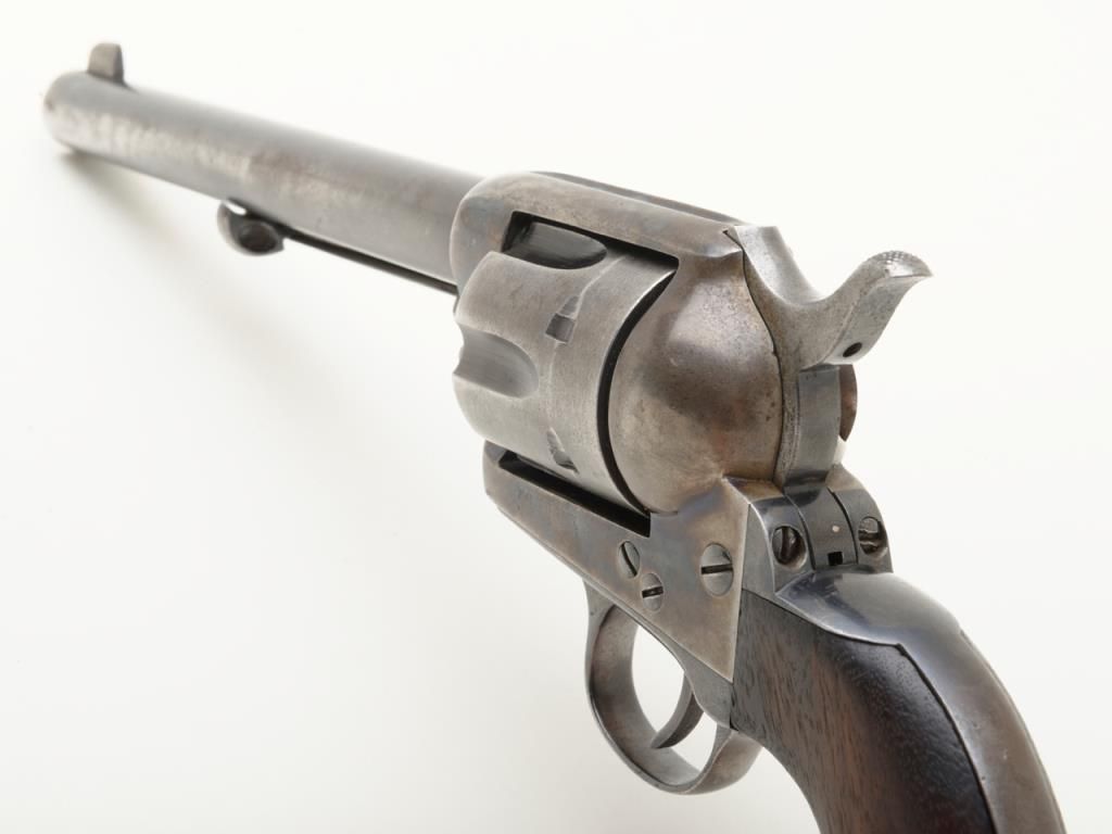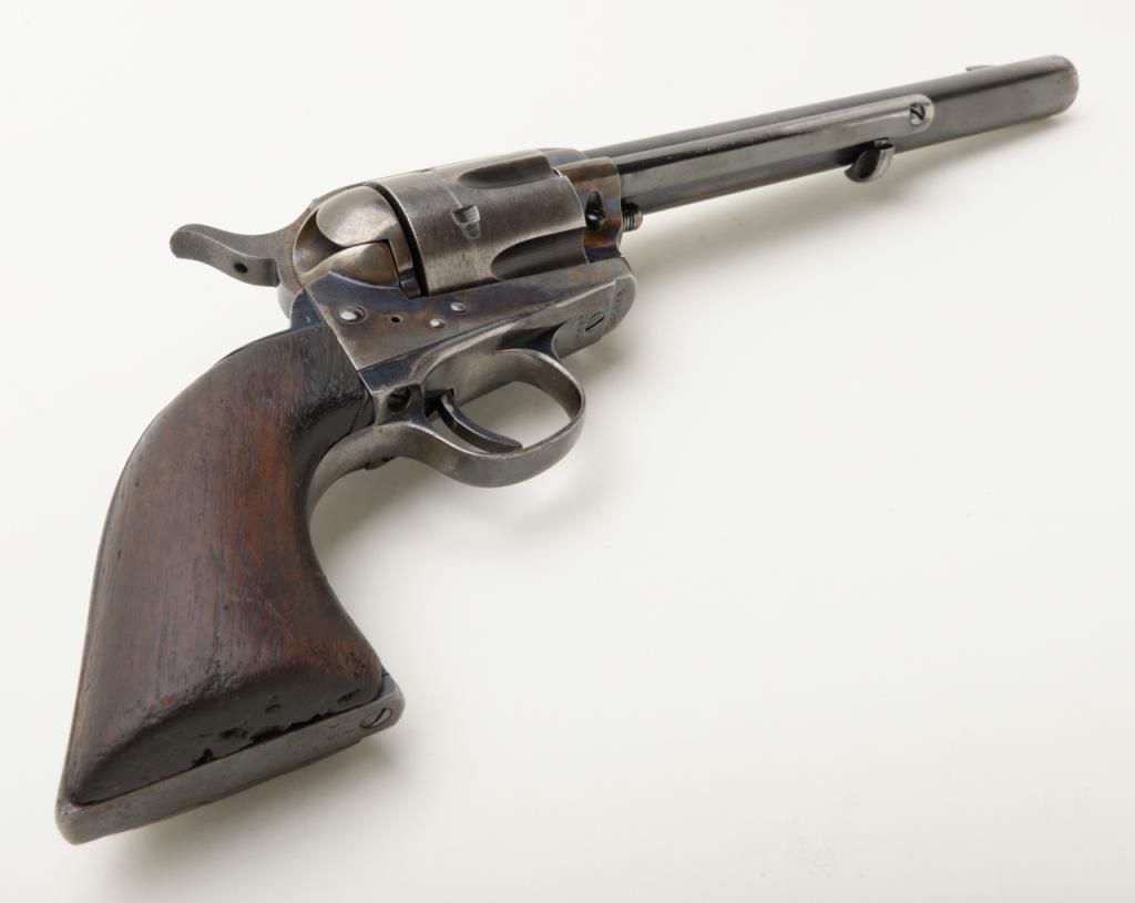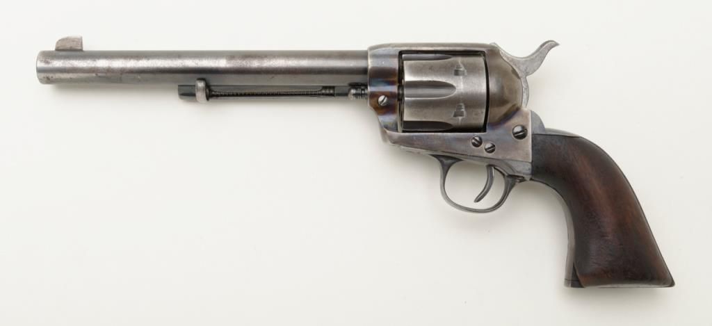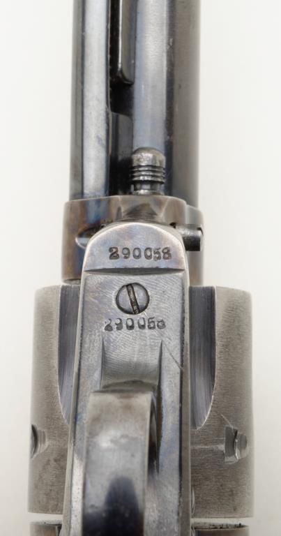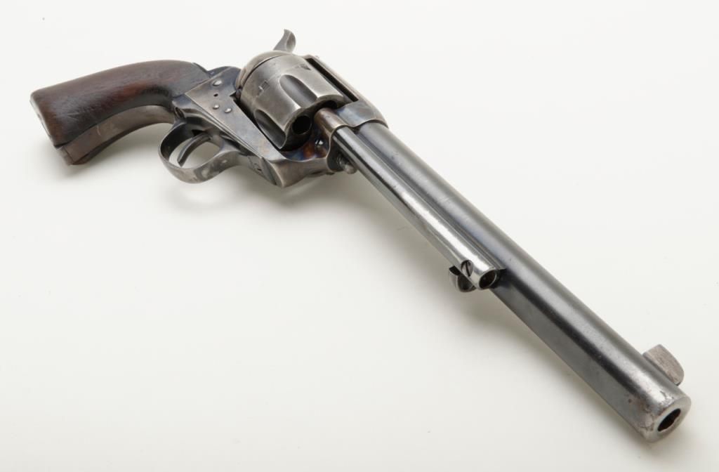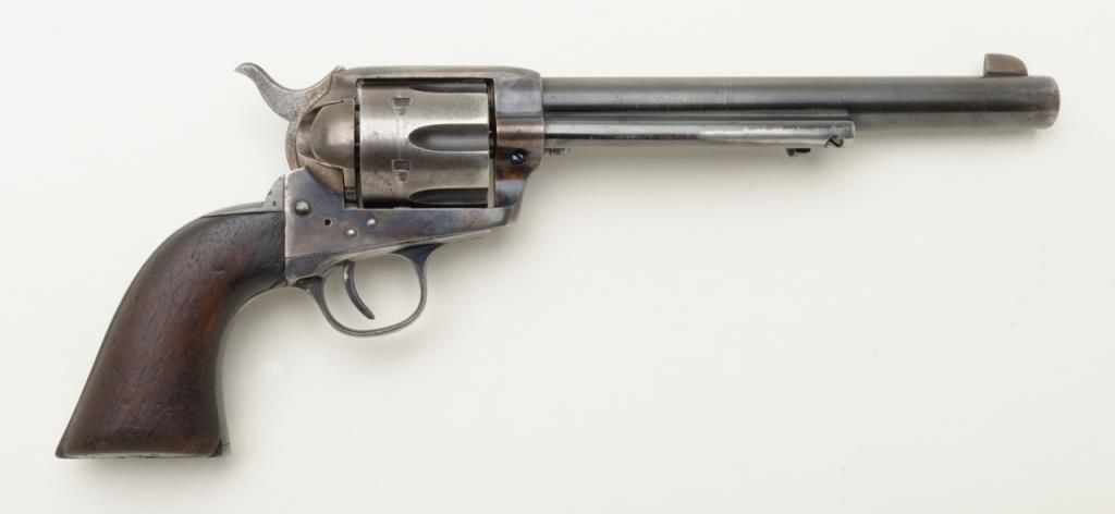 Colt SAA revolver, .32 W.C.F. cal., 7-1/2” barrel, blue and case hardened finish, wood grips, #290058 in overall good condition as restored; good bore, good action, considerable muted re-blue and fiery re-case colors; good grips with knackering to the butt end of the grip and an old small loss to the left grip’s front toe. (C&R/PPT). Est.: $800-$1,600.