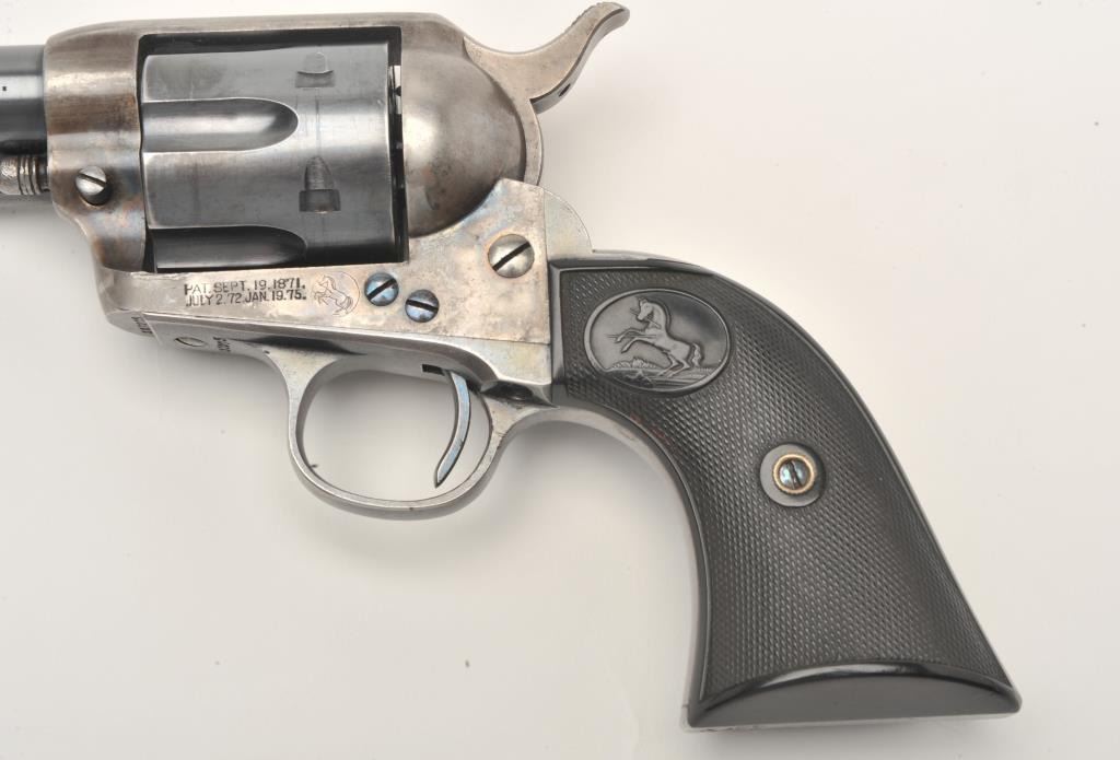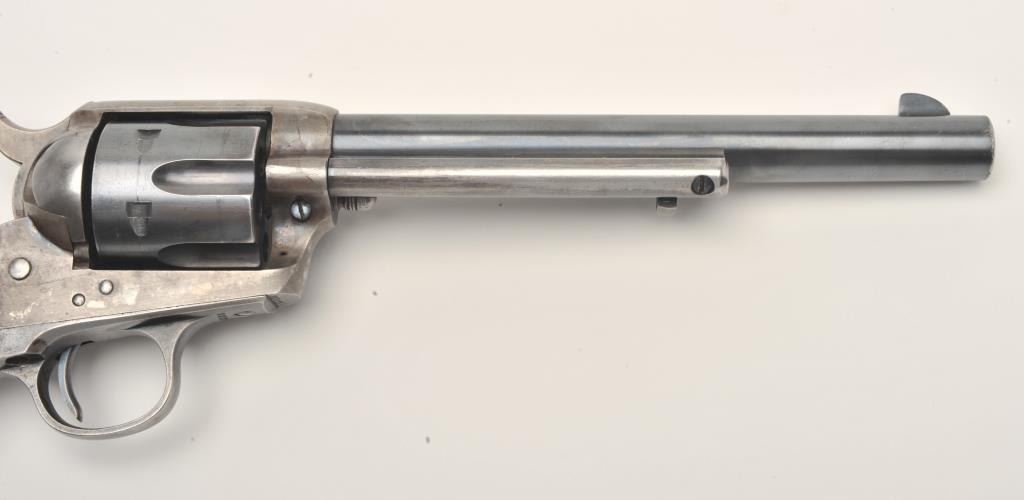 Colt SAA revolver, .32 W.C.F. caliber, 7.5” barrel, blued and case hardened finish, checkered hard rubber grips, S/N 223275, in overall very good to fine condition showing the majority of its original blued finishwith traces of original case colors on the frame, balance gone to silver tone, crisp action, sharp markings, fine bore and very good grips with a small old chip out of the front bottom of right grip. Accompanied by a Colt factory letter which states caliber as .44/40 and barrel length as 4.75”; blue finish, stocks “Not Listed”, shipped to Simmons Hardware Co., St. Louis, MO., on March 12, 1902, forty guns in shipment. (C&R/No PPT). Est.: $1,500-$3,000.