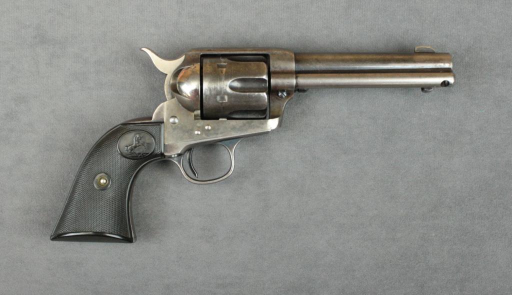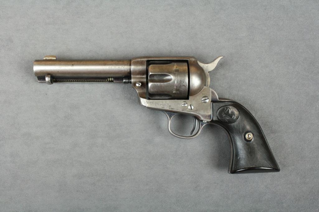 Colt SAA revolver, .32 WCF cal., 4-3/4”  barrel, blue and case hardened finish,  checkered black hard rubber grips, #183257.  This gun is in overall very good condition  showing approx. 15% original blue inprotected areas with some slight faded case  colors remaining on the frame with balance  gone to a silvery color; overall good bore,  action and markings; grips are very good;  replaced cylinder pin; front sight has beenreduced at time of use.  A nice SAA that  should letter around 1899 or 1900.  Est.:   $1,250-$2,500.