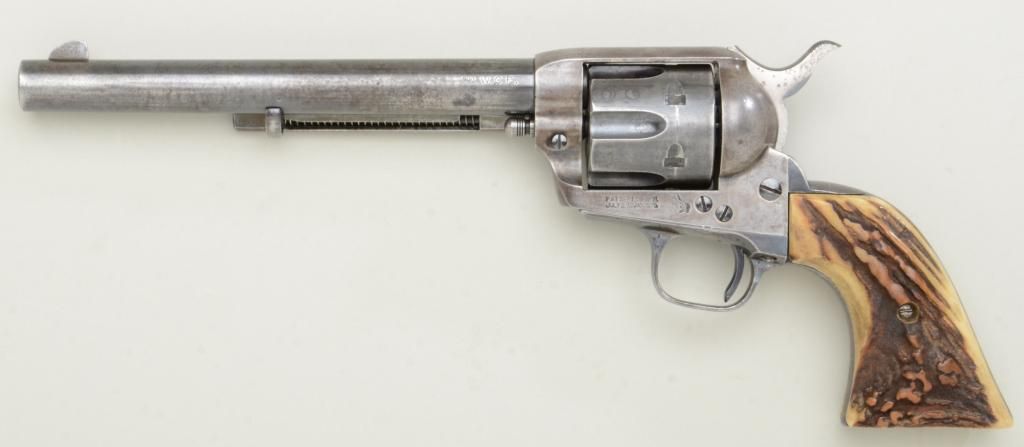 Colt SAA revolver, .32 WCF cal., 7-1/2” barrel, blue and case hardened finish, thick stag grips, #345463. This gun is in overall fine condition showing approx. 40% original blue and approx. 30% original case colors onthe frame confined primarily to protected areas with balance gone to a pleasing silvery tone; fine bore, crisp action, sharp markings and beautiful old well-fitted stag grips. Est.: $2,500-$3,500.