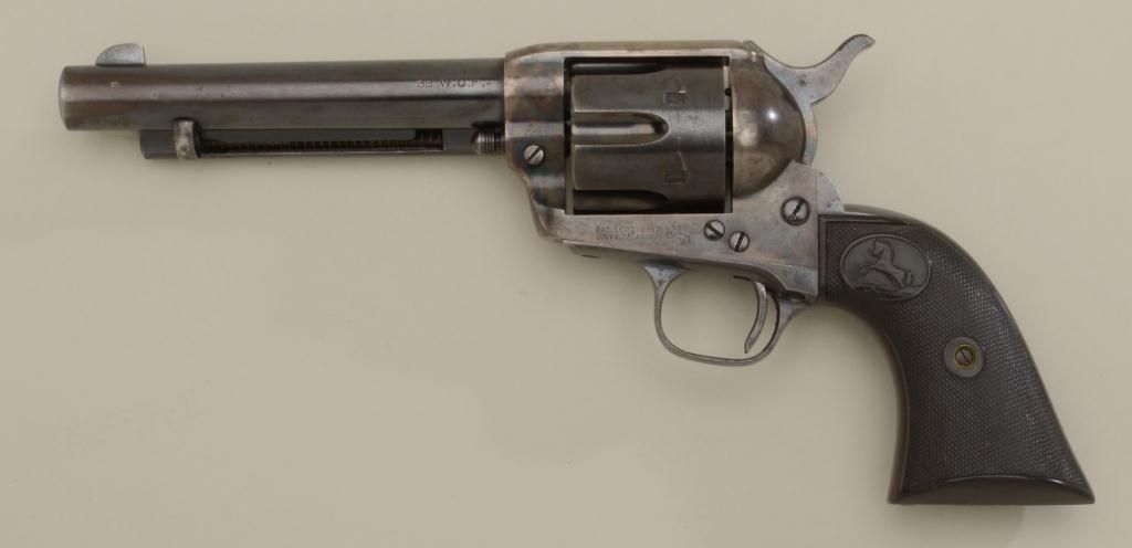 Colt SAA revolver, .32WCF cal., 5-1/2” barrel, blue and case hardened finish, checkered black hard rubber grips, #355859. This gun is in overall fine condition showing approx. 75% original blue on barrel andcylinder with a spot of pitting on the right side of the front sight; approx. 75% original case colors on the frame; fine bore, crisp action, sharp markings and very good to fine grips showing an old small chip to the bottom edge of the left grip; circa 1934 production and a really nice straight gun. Est.: $2,000-$3,000.
