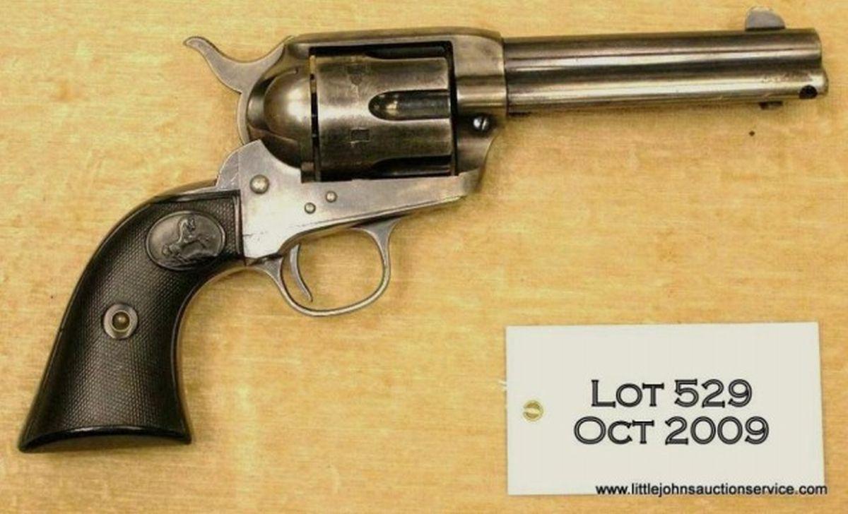 Colt SAA revolver, 38-40 cal., 4-3/4” barrel, blue and case hardened finish, checkered hard rubber grips, #307519. This gun is in overall very good condition showing approx. 50% original blue and approx. 70% muted case colors with some knackering to the bottom side of the barrel where the cylinder pin was improperly removed; crisp action, sharp markings, good bore, good grips. All features confirmed by Colt factory letter except type of stocks “Not Listed”; shipped toHibbard, Spencer, Bartlett & Co., Chicago, Illinois on December 10, 1908, one of 10 guns in shipment. Accompanying this gun is a handwritten note dated April 13, 2006 from the consignor that states “This gun was obtained from the estate ofProfessor Harry L. Kent of Austin, Texas. Professor Kent grew up in New Mexico. As a young man he attended college at one of the military universities in New Mexico. While attending college, he became a reserve U.S. Army Officer. .. . His personal firearms record left a notation that he acquired Colt Single Action Army (serial number 307,519) a 4-3/4” 38-40, from Sheriff Philipe Lucero in 1926. Sheriff Lucero was Sheriff of Donna Anna County, New Mexico”. Est.: