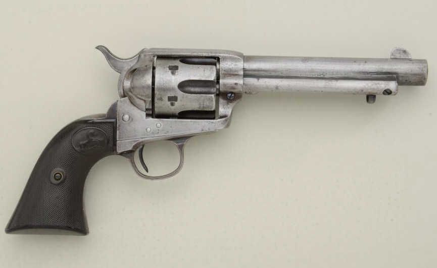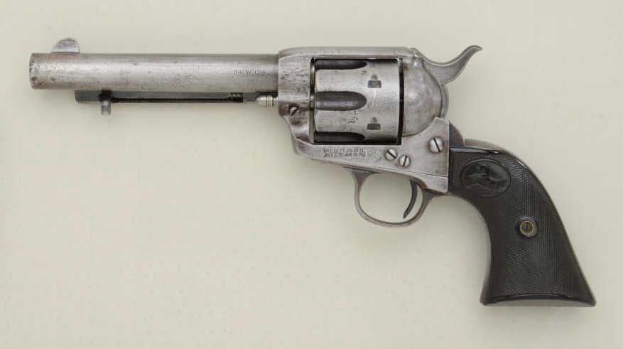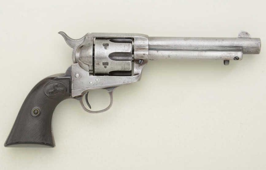 Colt SAA revolver, .38-40 cal., 5-1/2” barrel, blue and case hardened finish, checkered black hard rubber grips, #222737. This gun is in overall good to very good condition showing traces of original blue inprotected areas of the ejector housing and backstrap with balance showing an old cleaning, very good bore, crisp action, sharp markings, very good grips; accompanied by a factory letter confirming features (stocksnot listed) and shipped to Blish, Mize & Silliman Hardware Co. in Atchison, Kansas on March 4, 1902, ten guns in shipment. Blish, Mize & Silliman founded their Company in 1871 and got its start by outfitting wagon trains headed west from Atchison. Est.: $1,800-$2,600.