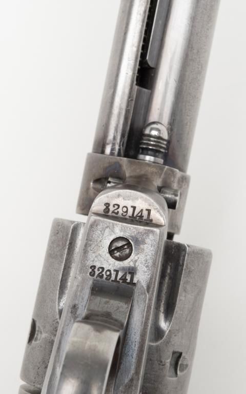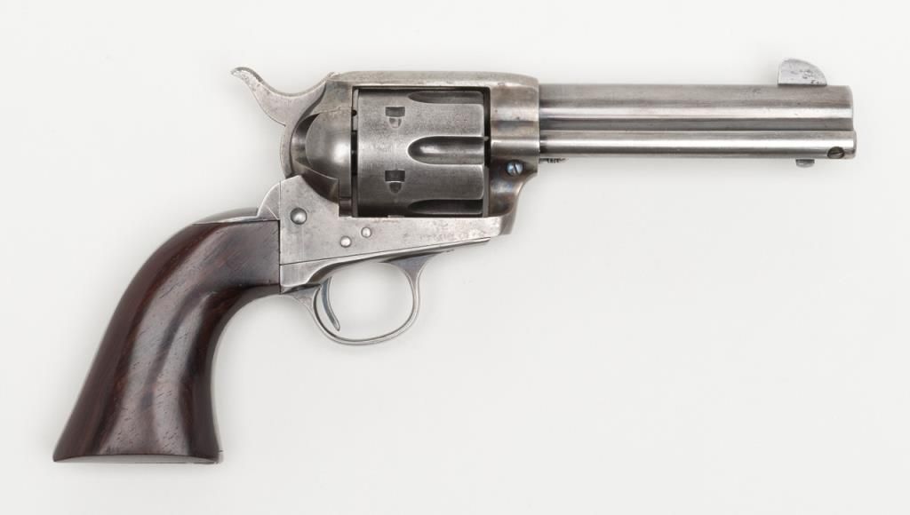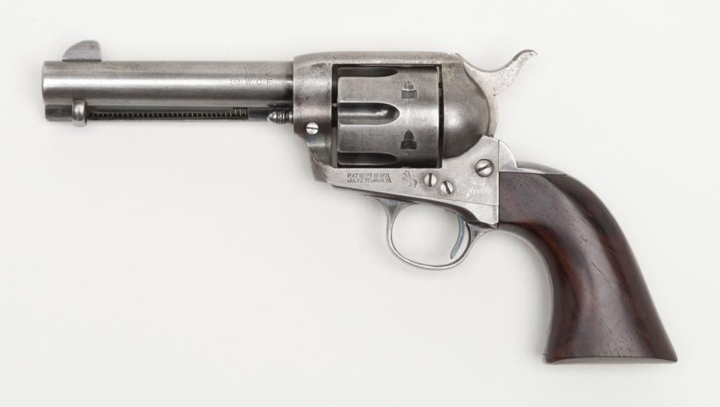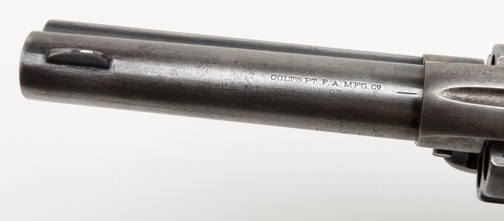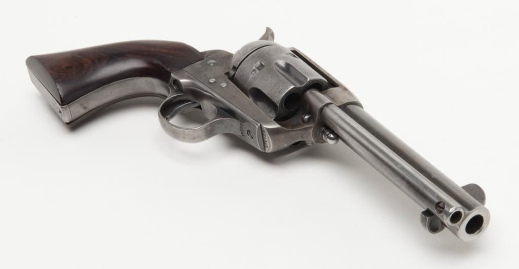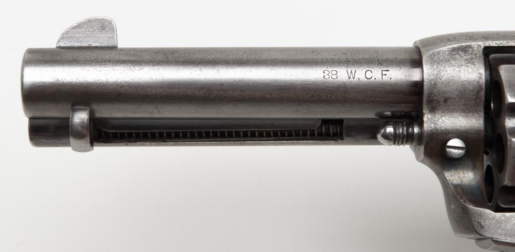 Colt SAA revolver, .38 W.C.F. cal., 4-3/4” barrel, blue and case hardened finish, smooth hardwood replacement grips, #329141 (circa 1914) in overall very good condition showing a grey patina with traces of original blue in protected areasincluding cylinder flutes and considerable vibrant original case colors on the front sides of the frame; very good bore, crisp action, good markings and very good to fine custom wood grips with exceptional graining. (C&R). Est.:$1,400-$2,800.