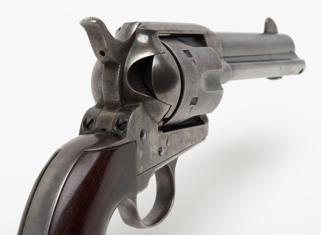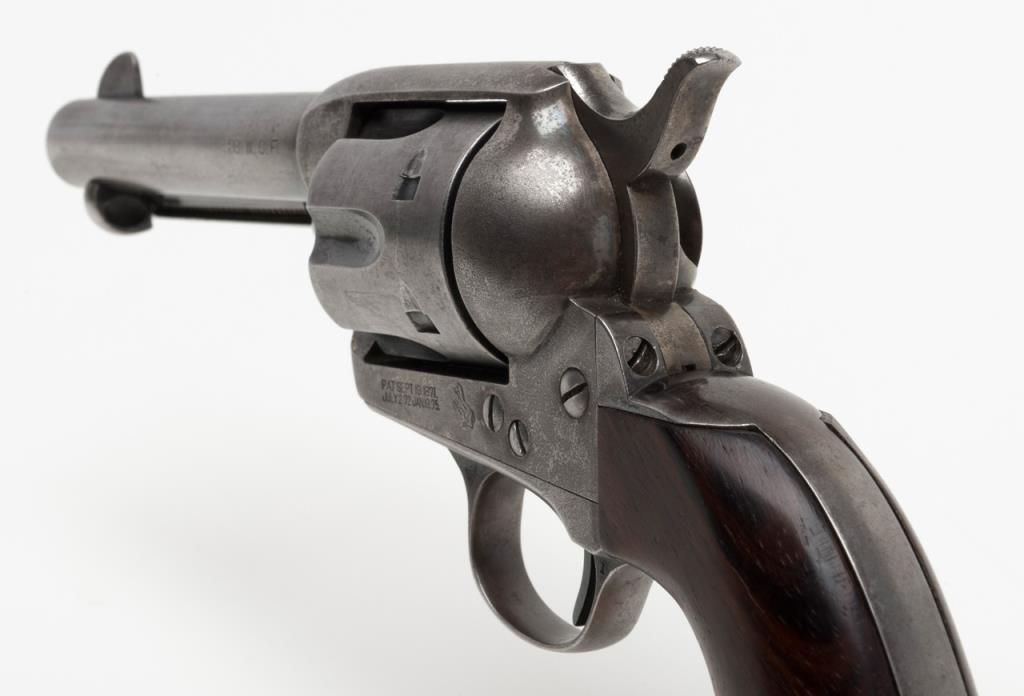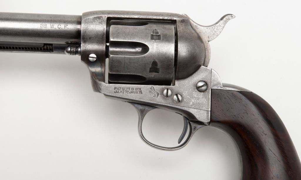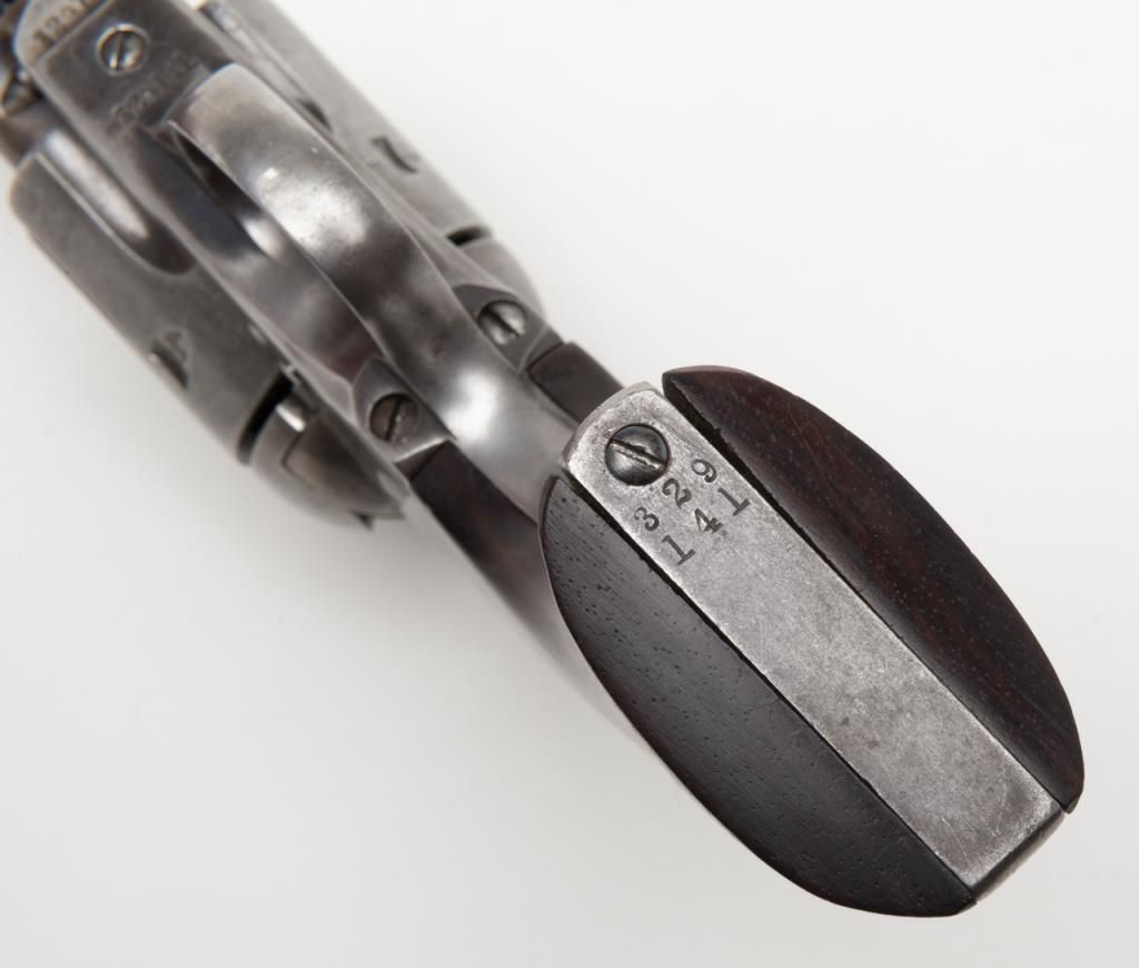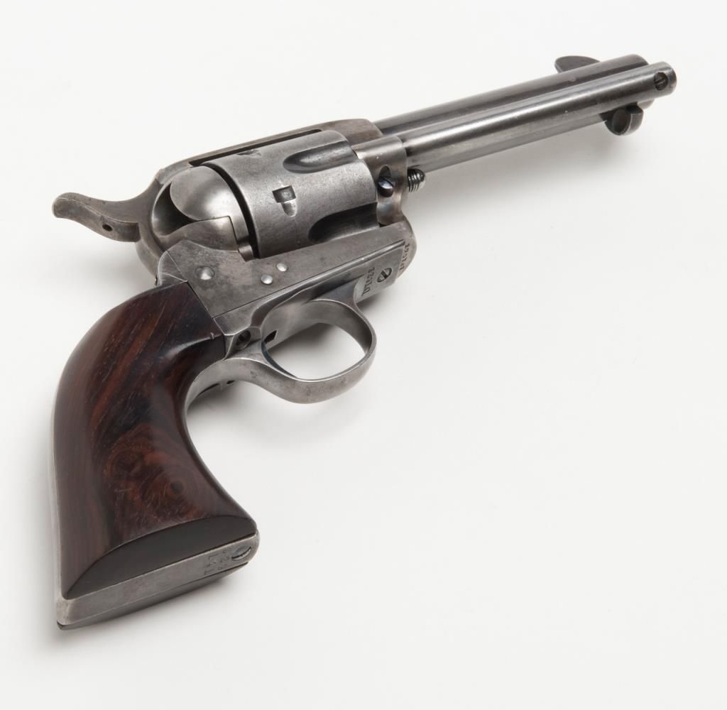 Colt SAA revolver, .38 W.C.F. cal., 4-3/4” barrel, blue and case hardened finish, smooth hardwood replacement grips, #329141 (circa 1914) in overall very good condition showing a grey patina with traces of original blue in protected areasincluding cylinder flutes and considerable vibrant original case colors on the front sides of the frame; very good bore, crisp action, good markings and very good to fine custom wood grips with exceptional graining. (C&R). Est.:$1,400-$2,800.