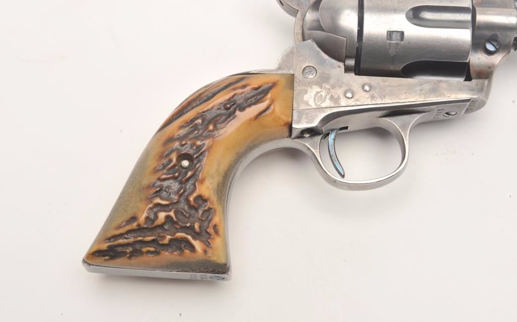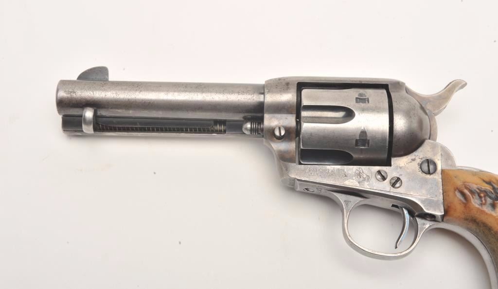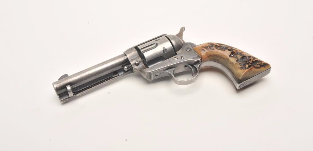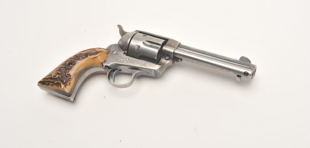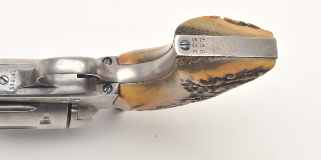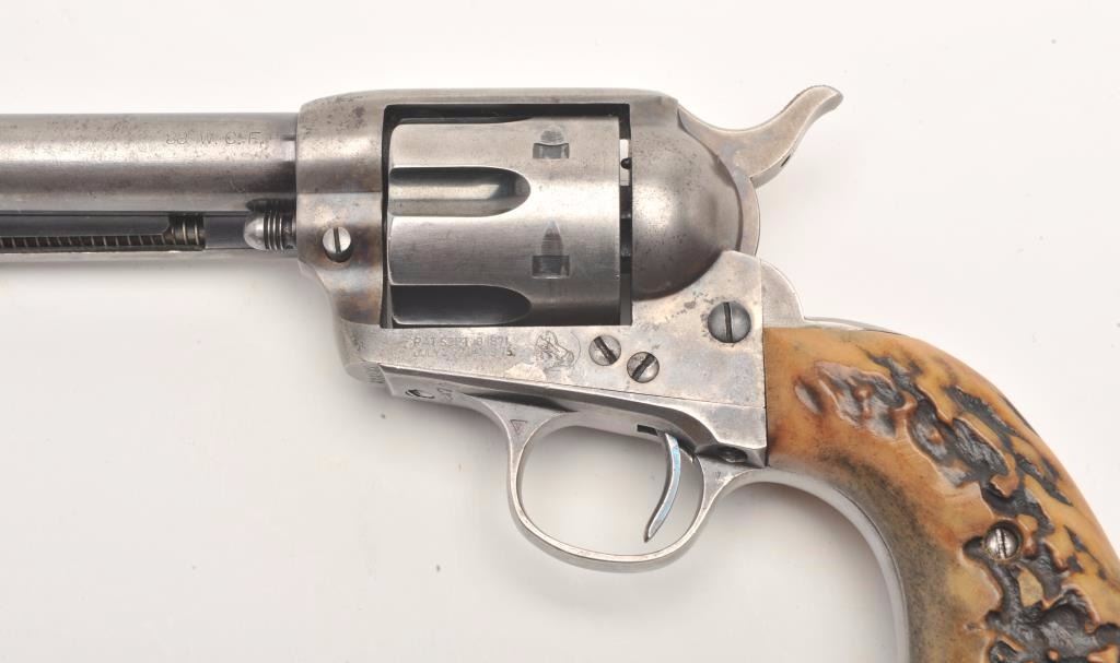 Colt SAA revolver, .38 W.F.C. caliber, 4.75” barrel, blued and case hardened finish, thick stage grips, S/N 322827, in overall very good + condition displaying original blue finish in protected areas of barrel assembly, cylinder and trigger guard with original case colors in protected areas of the frame; overall good bore, crisp action and good markings, beautiful stag grips; accompanied by a Colt factory letter confirming featuresexcept type of stocks “Not Listed”; shipped to A. Steinfeld & Co., Tucson, Arizona on May 23, 1912, three guns in shipment. (C&R/No PPT). Est.: $2,000-$4,000.