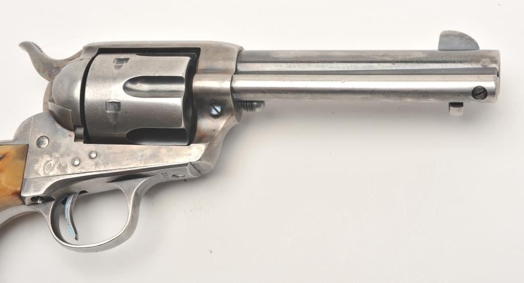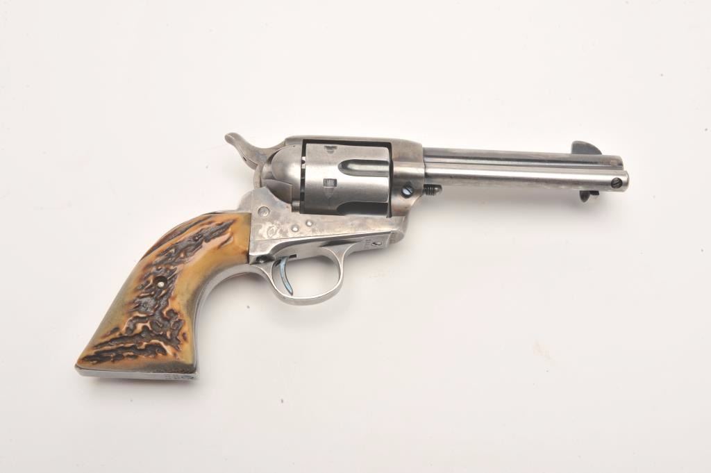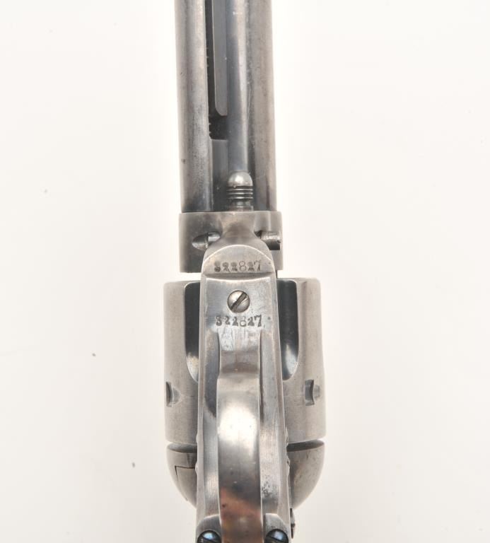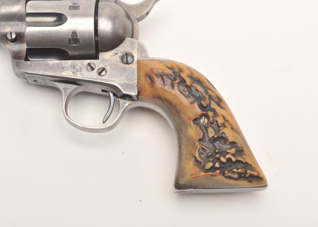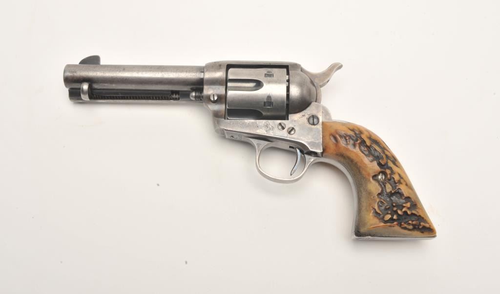 Colt SAA revolver, .38 W.F.C. caliber, 4.75” barrel, blued and case hardened finish, thick stage grips, S/N 322827, in overall very good + condition displaying original blue finish in protected areas of barrel assembly, cylinder and trigger guard with original case colors in protected areas of the frame; overall good bore, crisp action and good markings, beautiful stag grips; accompanied by a Colt factory letter confirming featuresexcept type of stocks “Not Listed”; shipped to A. Steinfeld & Co., Tucson, Arizona on May 23, 1912, three guns in shipment. (C&R/No PPT). Est.: $2,000-$4,000.