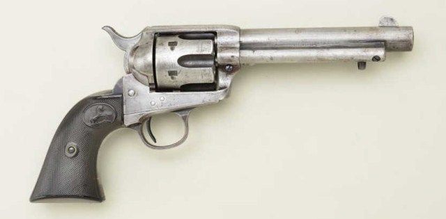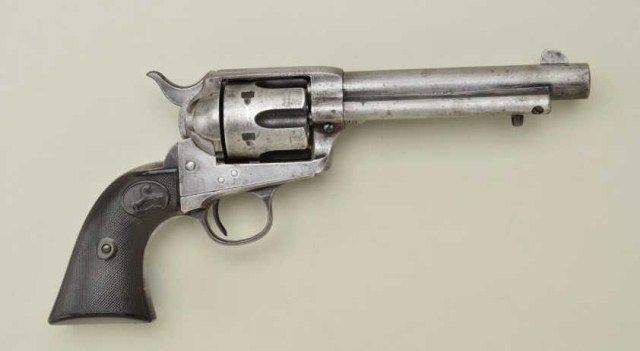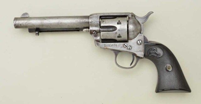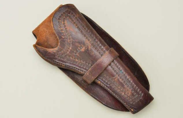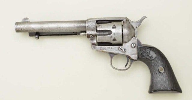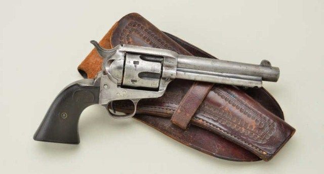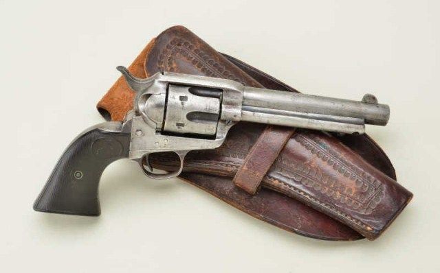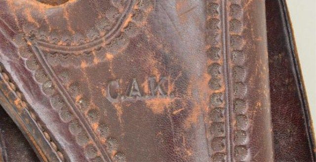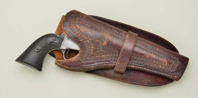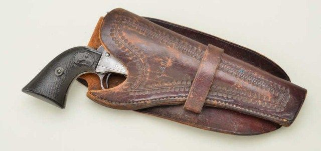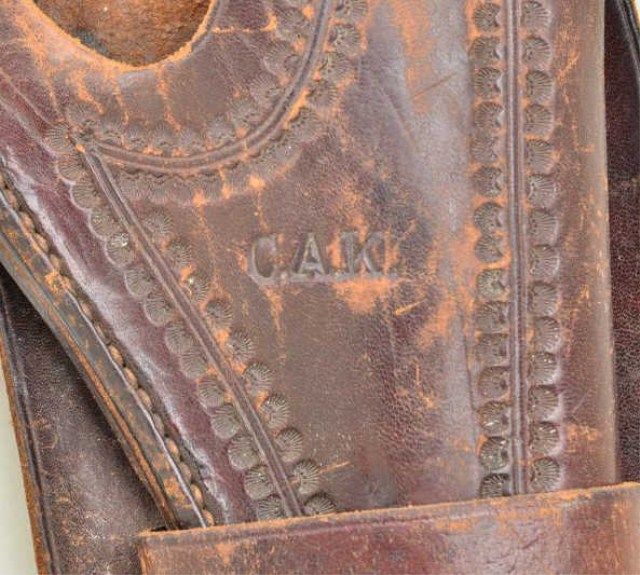 Colt SAA revolver, .38 WCF cal., 5-1/2” barrel, blue and case hardened finish, checkered black hard rubber grips, #222737; with tooled single loop leather holster marked “C.A.K.”. This gun is in overall goodcondition showing all matching visible numbers, good bore, crisp action, sharp markings, very good grips, traces of original blue in protected areas, balance of gun has been cleaned and displays a grey patina,replaced cylinder pin; factory letter confirms features except type of stocks “Not Listed”; shipped to Blish, Mize & Silliman Hardware Co., Atchison, Kansas on March 4, 1902, 10 guns in shipment. Holster is inoverall good condition showing thick harness leather construction and nice tooling. In 1902, Kansas was still experiencing activities of the old west including trail herding, freighting, ranching, etc.; a decent SAA with a great shipping destination. Est.: $1,500-$2,500.