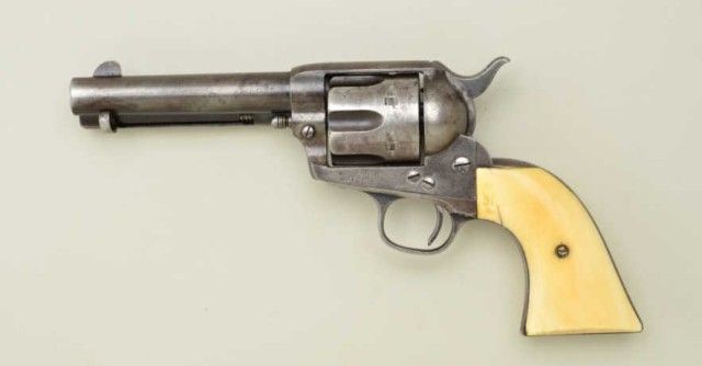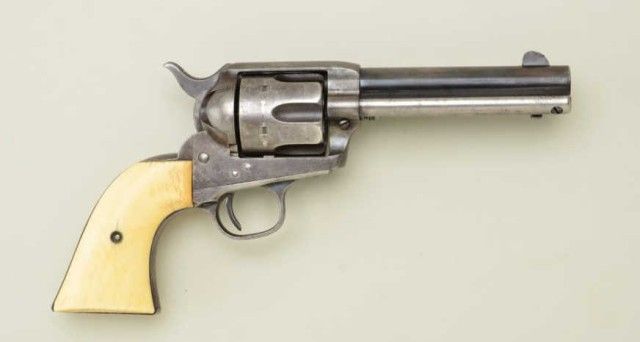 Colt SAA revolver, .41 Colt cal., 4-3/4” barrel, blue and case hardened finish, old ivory grips, #169445.This gun is in overall very good condition showing traces of original blue and case colors in protectedareas; crisp action and markings, good to very good bore; beautiful mellow ivory two piece grips that are slightly undersized for this gun; a good looking old first generation Single Action with all matching visiblenumbers; should be factory lettered. Est.: $1,800-$2,800.