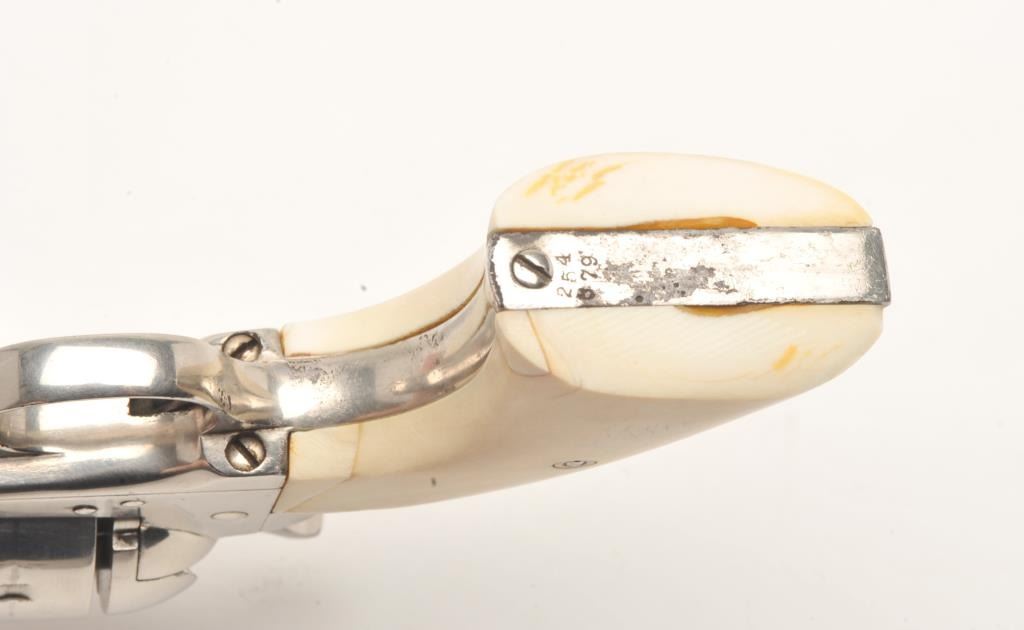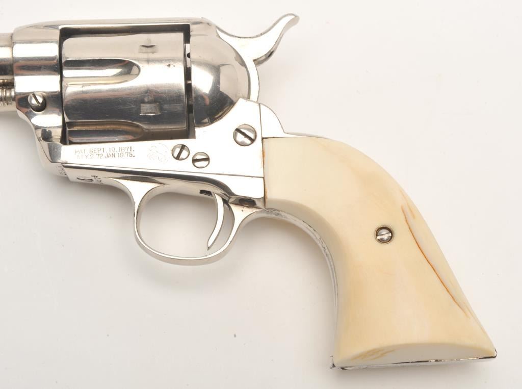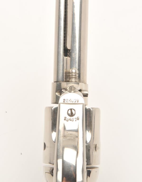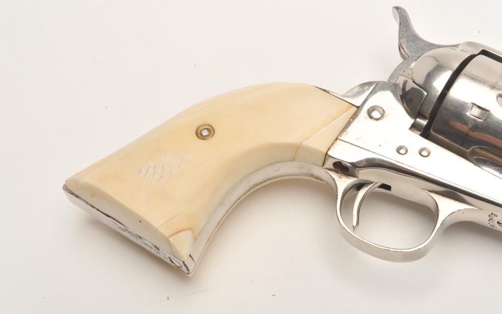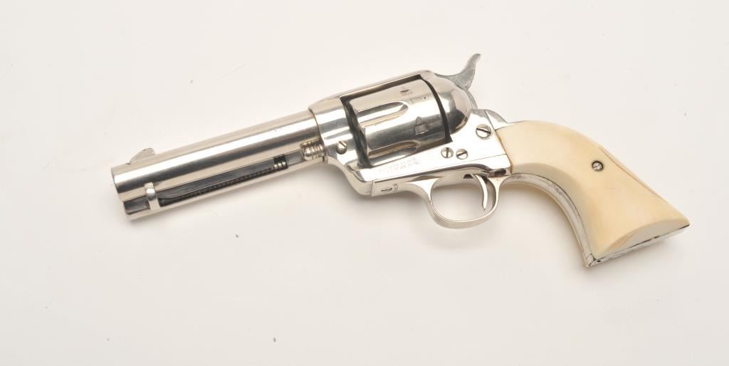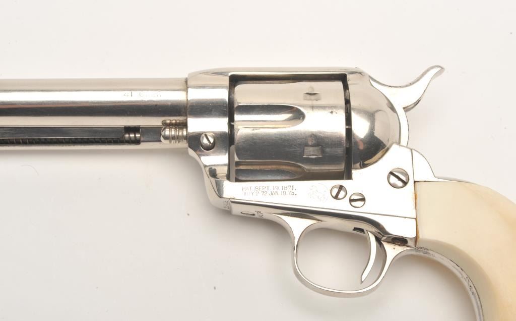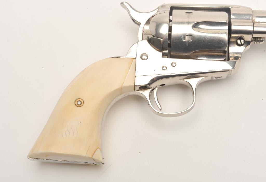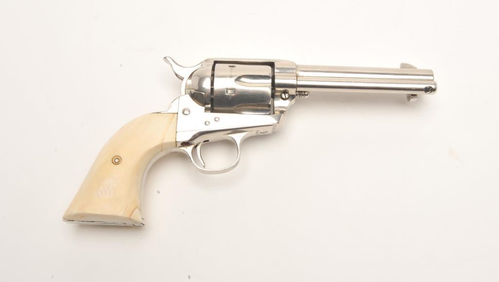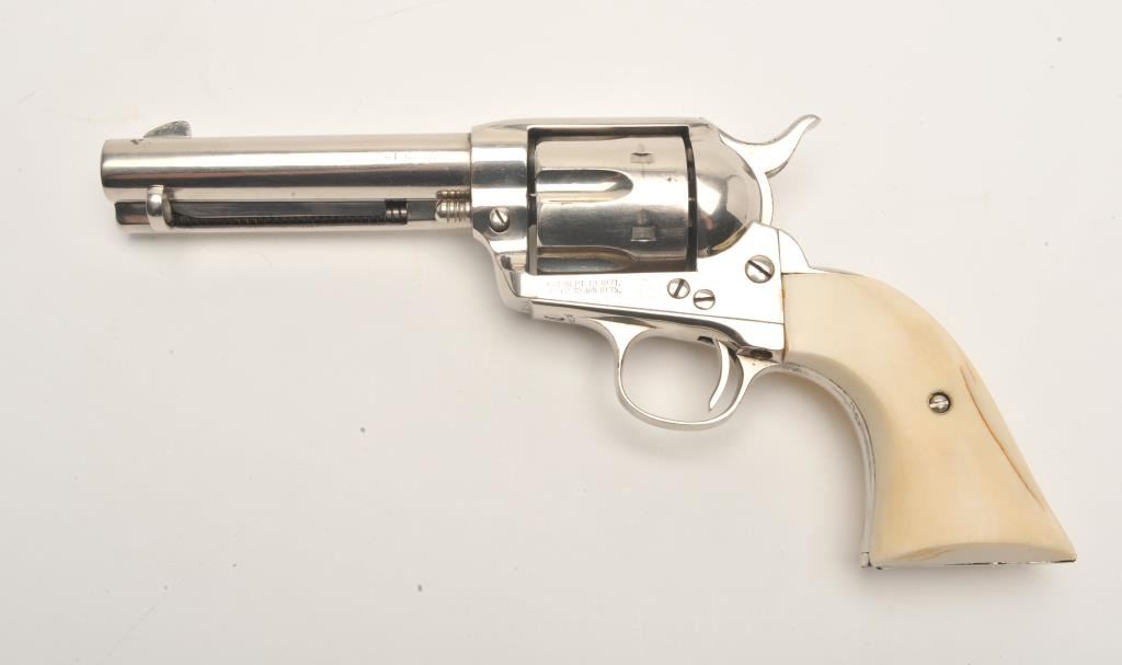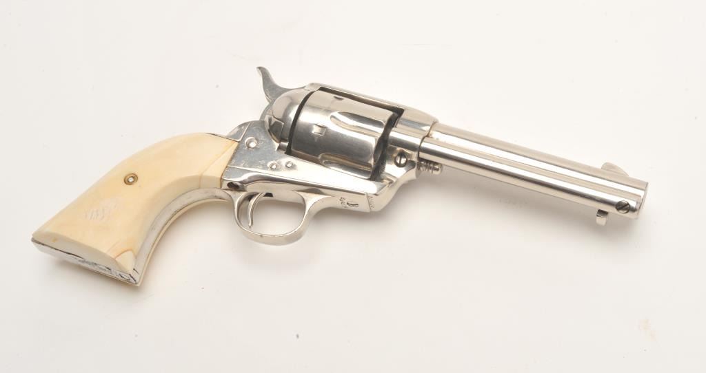 Colt SAA revolver, .41 Colt caliber, 4.75” barrel, old re-finished nickel, stag or bone grips, S/N 254679, in overall good condition showing the majority of the old re-nickel finish, good bore, crisp action, goodmarkings overall, good non-factory grips with a couple old repairs to the right grip. Accompanied by a Colt factory letter confirming caliber and barrel length with “Blue” finish listed and type of stocks “NotListed”; shipped to Simmons Hardware Co., St. Louis, Missouri on May 31, 1905, fifteen guns in shipment. (C&R/No PPT). Est.: $1,250-$2,500.
