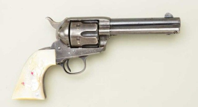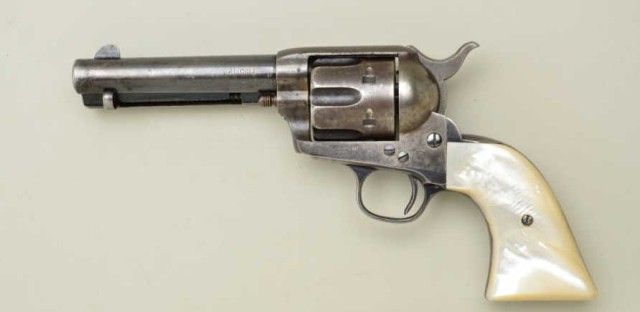 Colt SAA revolver, .41 cal., 4-3/4” barrel, blue and case hardened finish, raised carved pearl grips, #135353. This gun is in overall very good to near fine condition showing approx. 35% original blue and traces oforiginal case colors on the frame with balance gone to a silvery tone, some scattered pin prick pitting at firing areas, good bore with some spots of erosion; crisp action and markings, nicely carved steerheadlater pearl grips with red eye inserts. Est.: $2,500-$3,500.