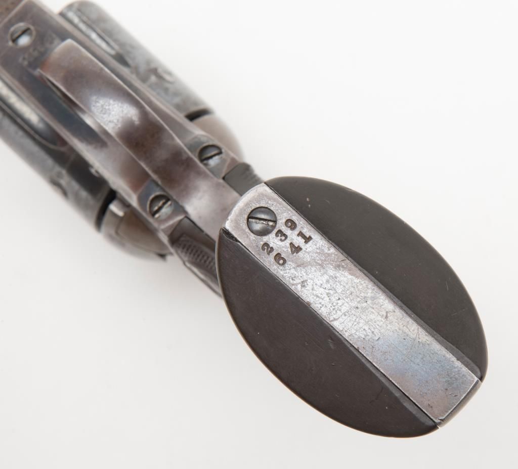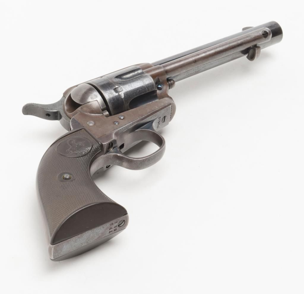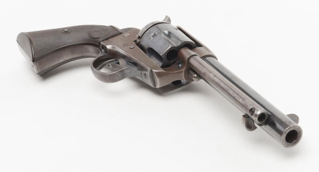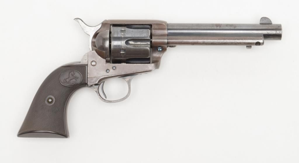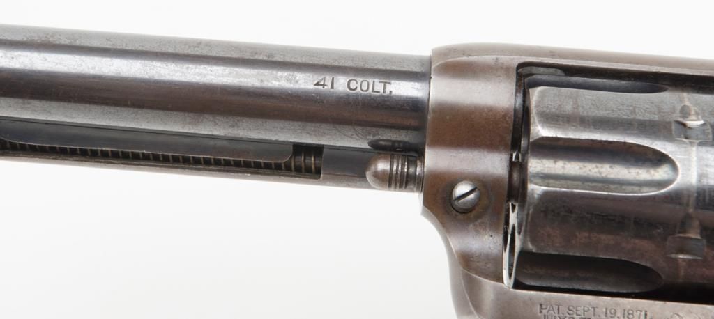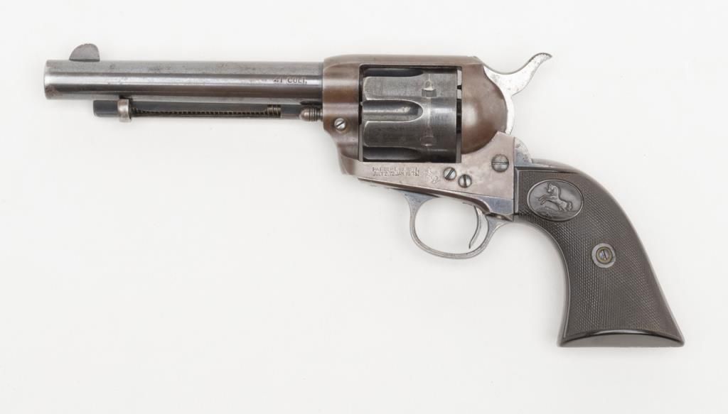Colt SAA revolver, .41 cal., 5-1/2” barrel, blue and case hardened finish, checkered hard rubber grips, #239641 (circa 1903), overall very good condition, approx. 50%-70% original blue, traces of case turning smoky grey with very good grips,good action, minty bore, all matching numbers. (C&R). Est.: $2,250-$4,500.