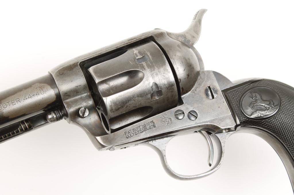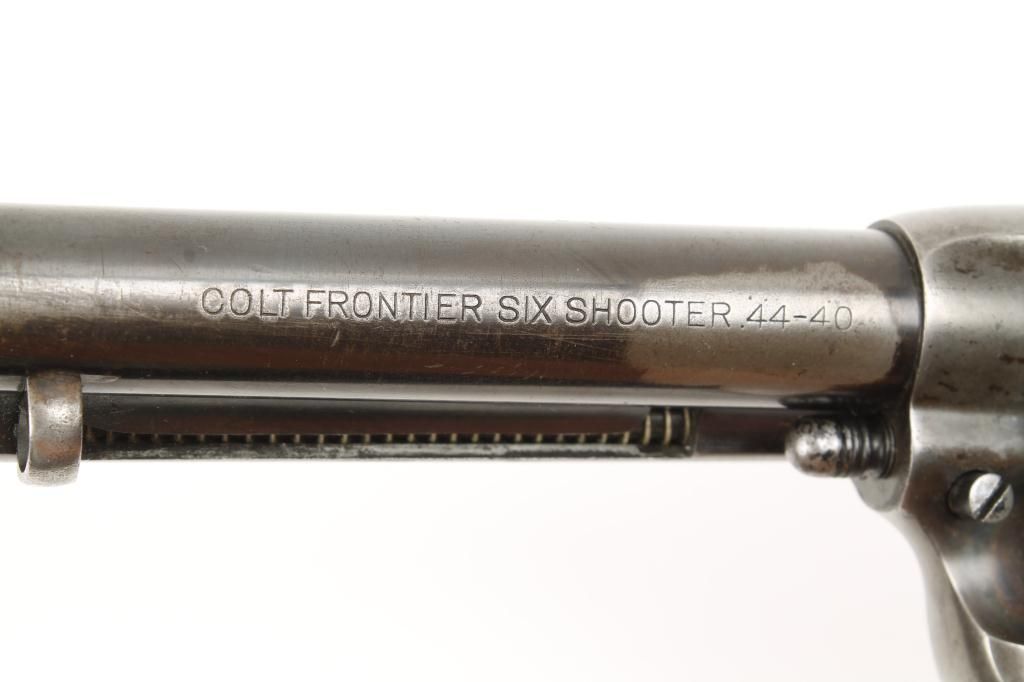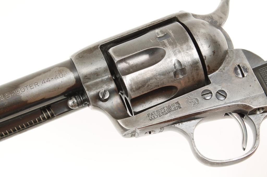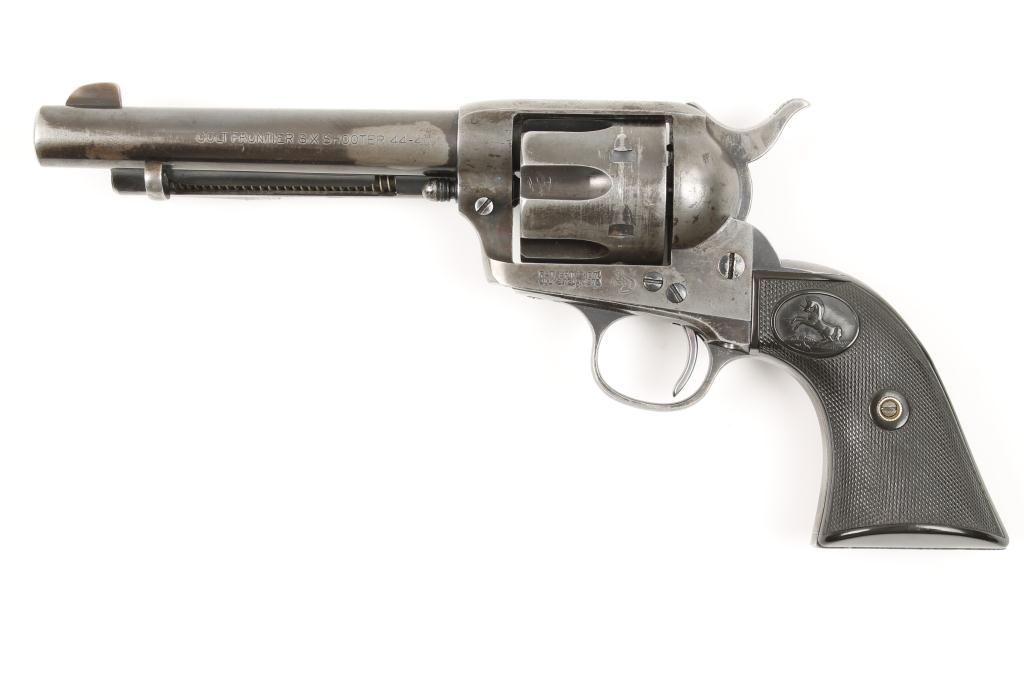 Colt SAA revolver, .44-40 cal., 5-1/2” barrel, blue and case hardened finish, checkered hard rubber grips, #225379. This gun is in overall very good to fine condition showing approx. 50% original blue to barrelassembly, cylinder and straps with approx. 30% original case colors on the frame and hammer with balance gone to a silvery tone and some scattered pitting on the top strap; bore is fine, action is crisp, markings aresharp and the grips are very good. Est.: $2,000-$4,000.