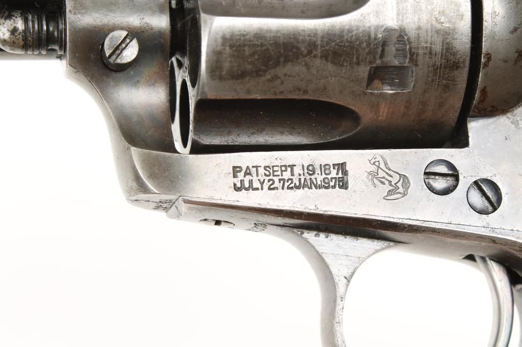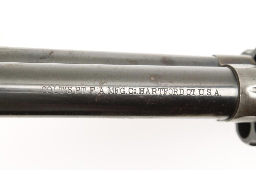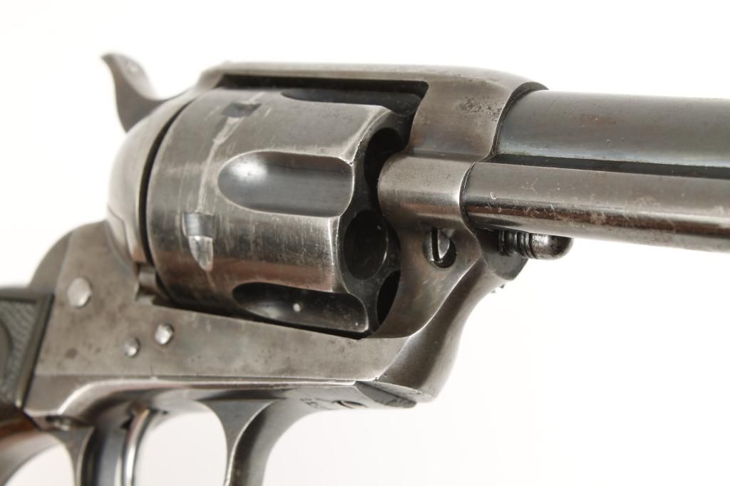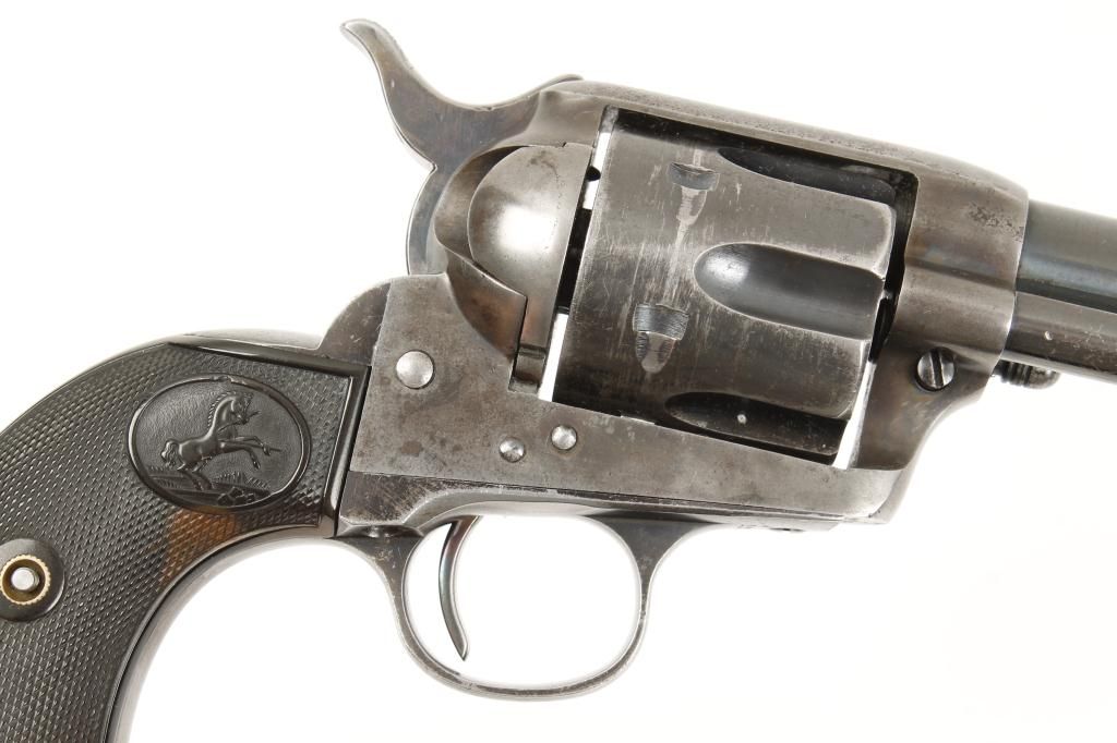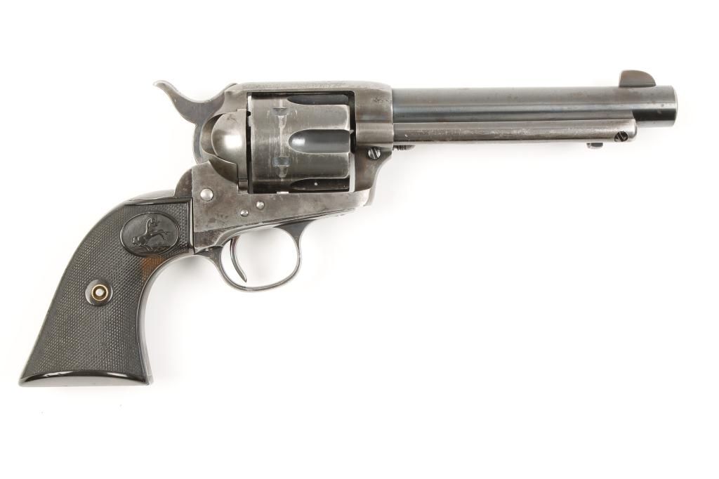 Colt SAA revolver, .44-40 cal., 5-1/2” barrel, blue and case hardened finish, checkered hard rubber grips, #225379. This gun is in overall very good to fine condition showing approx. 50% original blue to barrelassembly, cylinder and straps with approx. 30% original case colors on the frame and hammer with balance gone to a silvery tone and some scattered pitting on the top strap; bore is fine, action is crisp, markings aresharp and the grips are very good. Est.: $2,000-$4,000.
