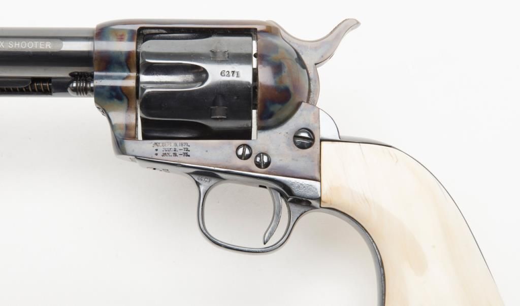 Colt SAA revolver, .44-40 cal., 7-1/2” barrel, etched panel, blue and case hardened finish, ivory grips, #96271 in overall very good condition as restored showing the majority of its re-blue and re-case color with full etched panel; good bore,crisp action and markings, ivory grips are very good + with age cracks and small old loss to right rear toe; with factory letter confirming features (stocks “Not Listed), shipped to Simmons Hardware Co., St. Louis, Mo. on Aug. 15, 1889, 50 guns inshipment. (Antique). Est.: $2,000-$4,000.