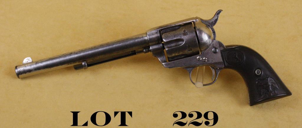 Colt SAA revolver, 44-40 cal., 7-1/2” barrel, nickel finish, checkered hard rubber eagle grips, #125205. This gun is in overall good condition showing approx. 35% original nickel finish with the balance worn to anuncleaned gray patina, scattered areas of erosion and pin prick pitting primarily at the firing areas, three line patent address, matching visible serial numbers, overall good bore and action, grips are worn but overallgood; accompanied by a factory letter that confirms features and indicates this was a one-gun shipment to Collins and Gordon Co., Omaha, Nebraska sent on February 18, 1888. A really nice honest blackpowder SingleAction. Est.: $3,500-$4,500.