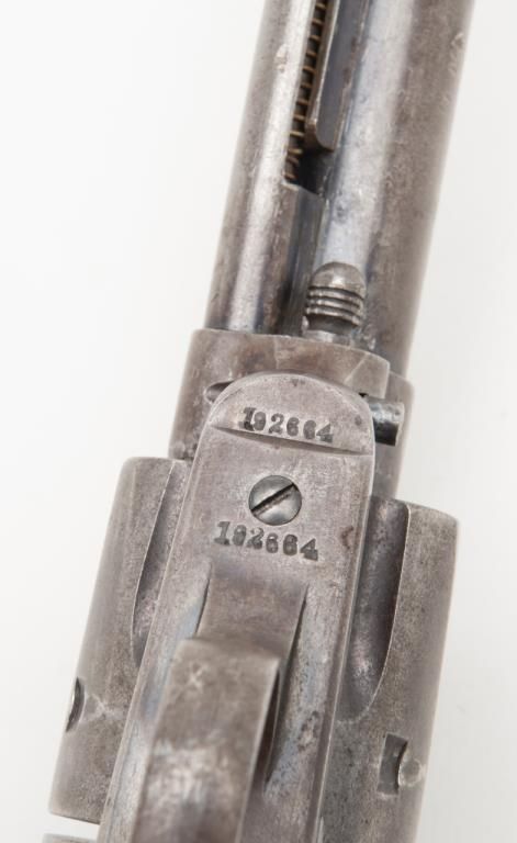 Colt SAA revolver, .44-40 cal., “Frontier Six Shooter”, 4-3/4” barrel, blue and case hardened finish, checkered black hard rubber grips, #192664 (circa 1900) in overall good to very good condition showing a general grey patina with sometraces of original blue in protected areas, crisp action, good markings and bore with some spots of light scattered pitting; grips are good with wear at bottom edges; accompanied by modern wood presentation casing with blue lining. (C&R).Est.: $1,200-$1,800.