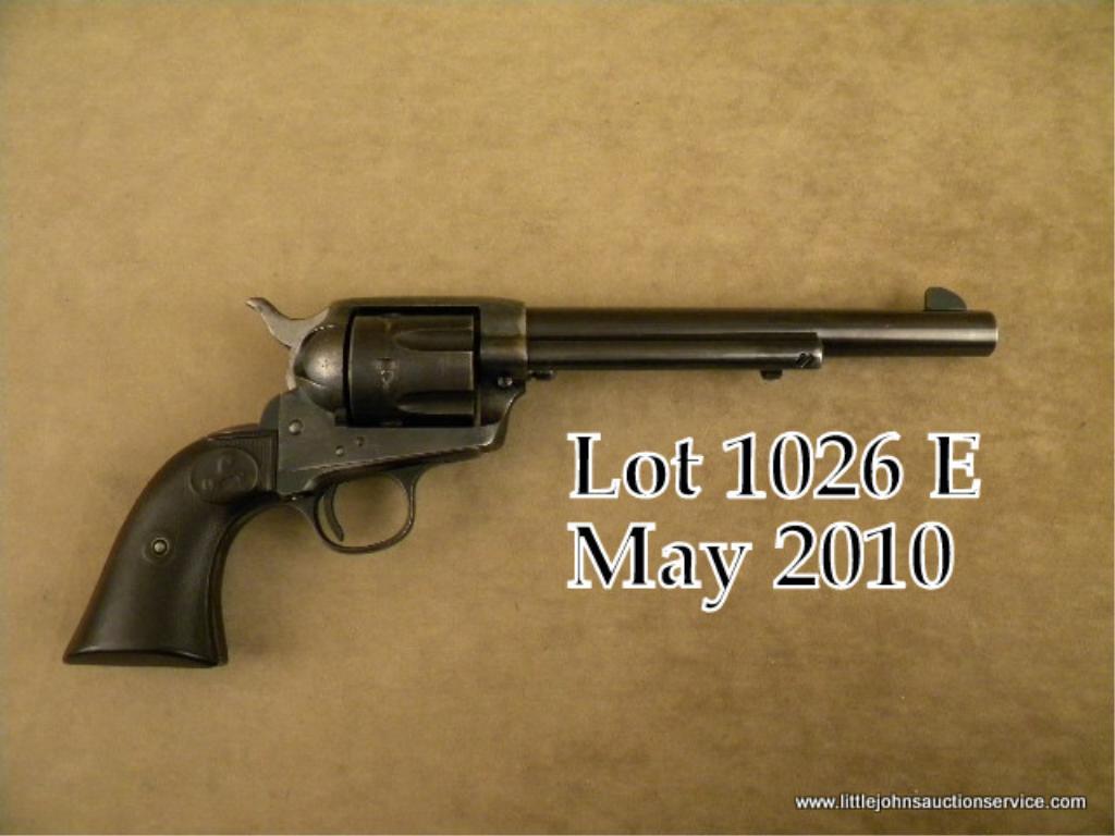 Colt SAA revolver, .44 Special cal., 7-1/2”  barrel, blue and case hardened finish, checkered  black hard rubber grips, #318292. This gun is in  overall good condition showing approx. 70% of what  appears to be an older quality re-finish, tracesof original case colors on the frame, good bore,  action and markings, overall worn but good grips  that are original Colt but do not fit perfectly to  this Single Action.   Est.:  $800-$1,600.