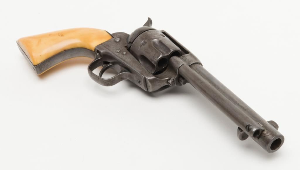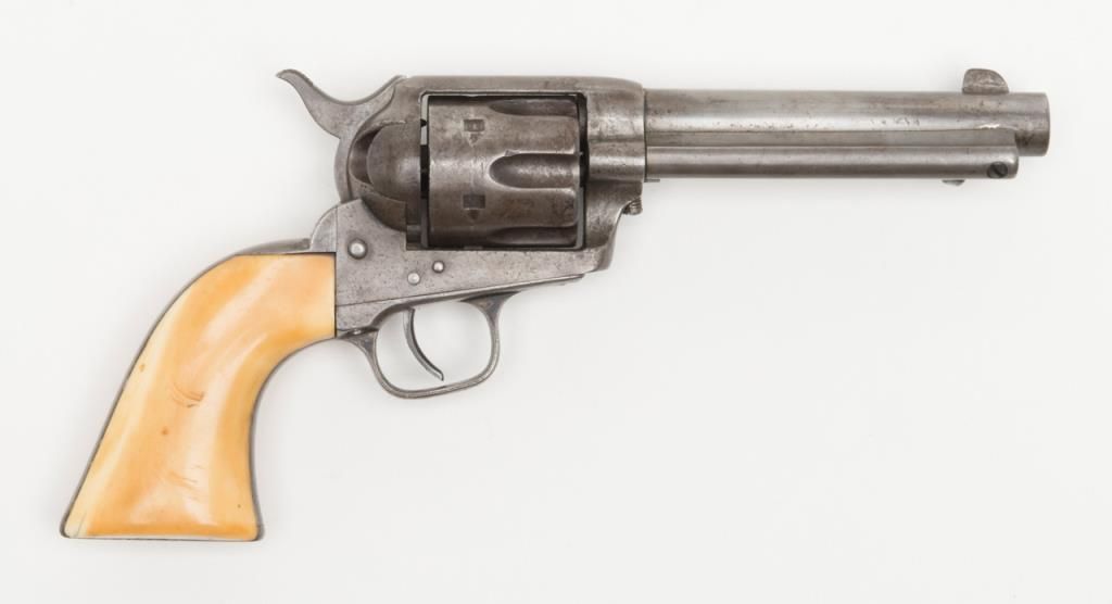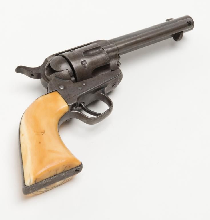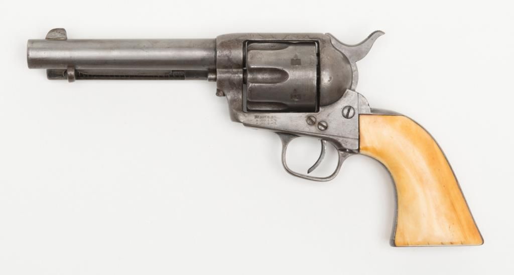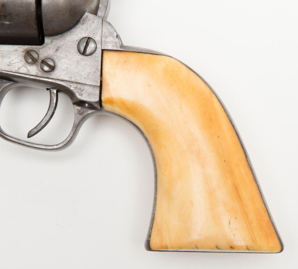 Colt SAA revolver, .44 cal., barrel period reduced to 5-1/8”, period ivory grips, #57950 in overall good to very good condition showing an even grey patina with scattered pinprick pitting and some erosion at firing areas; good action, rough bore,readable markings, old replacements of cylinder pin and securing screw; beautiful mellow period ivory grips with age cracklature on the butt; a circa 1880 Single Action with lots of character! (Antique). Est.: $1,400-$2,800.