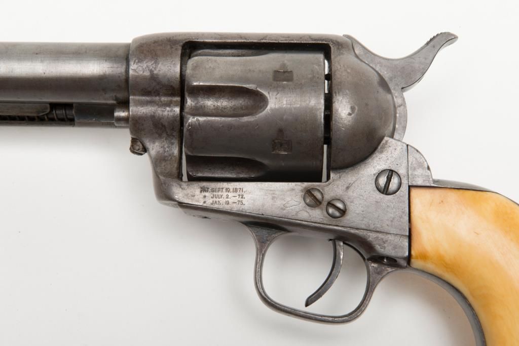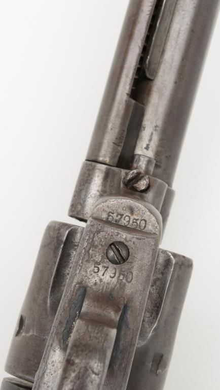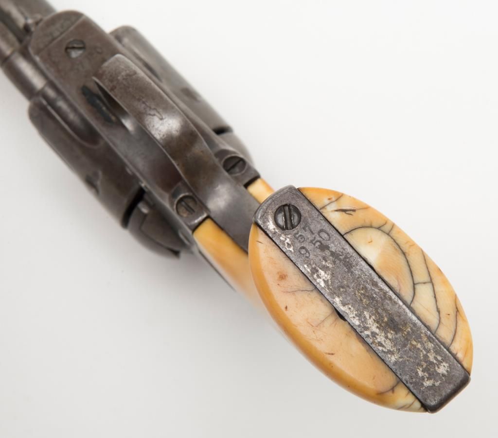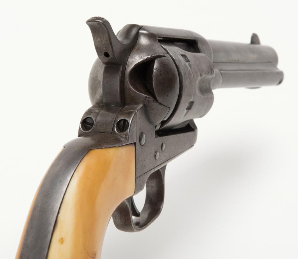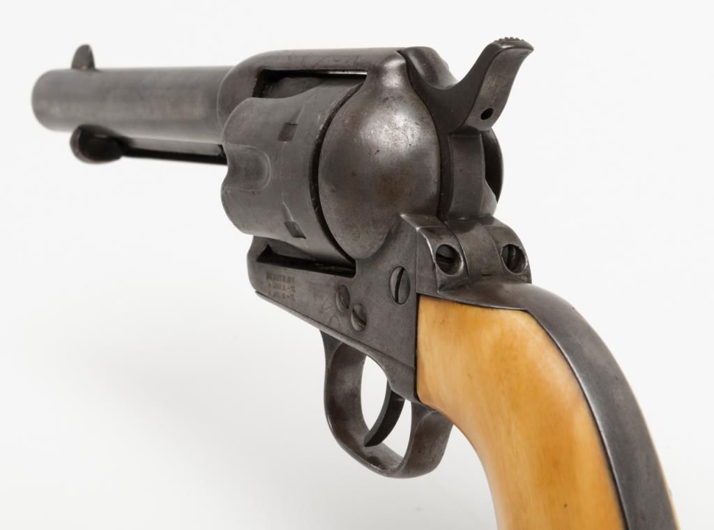 Colt SAA revolver, .44 cal., barrel period reduced to 5-1/8”, period ivory grips, #57950 in overall good to very good condition showing an even grey patina with scattered pinprick pitting and some erosion at firing areas; good action, rough bore,readable markings, old replacements of cylinder pin and securing screw; beautiful mellow period ivory grips with age cracklature on the butt; a circa 1880 Single Action with lots of character! (Antique). Est.: $1,400-$2,800.