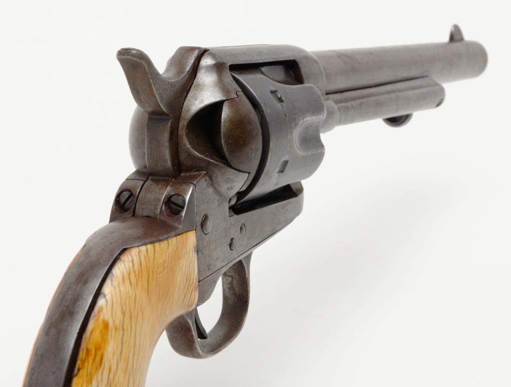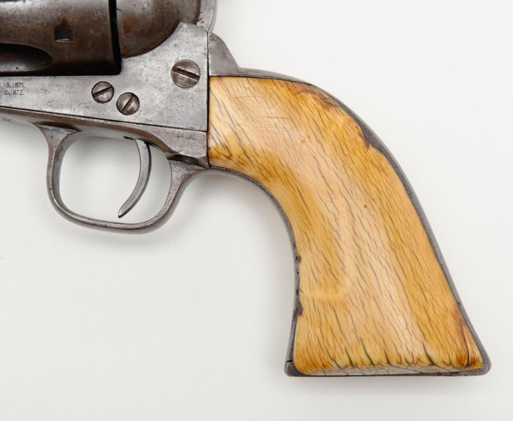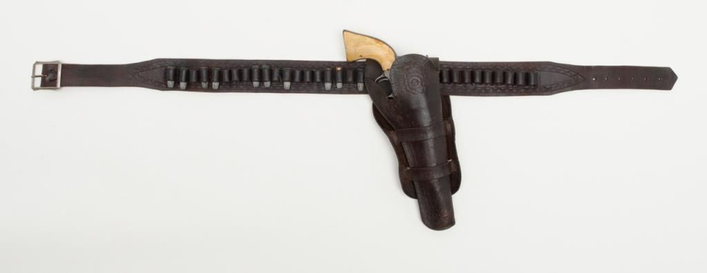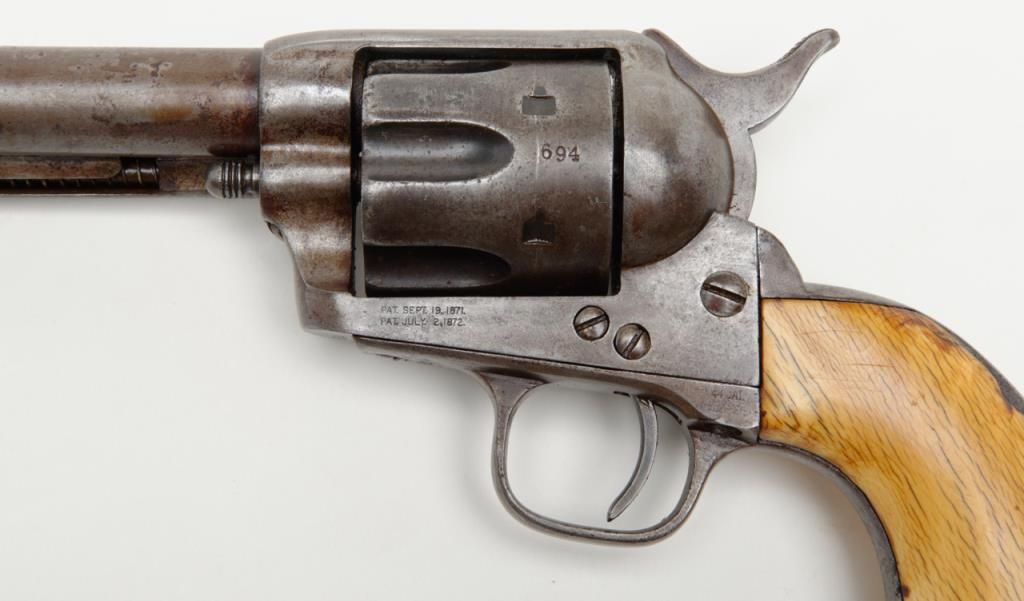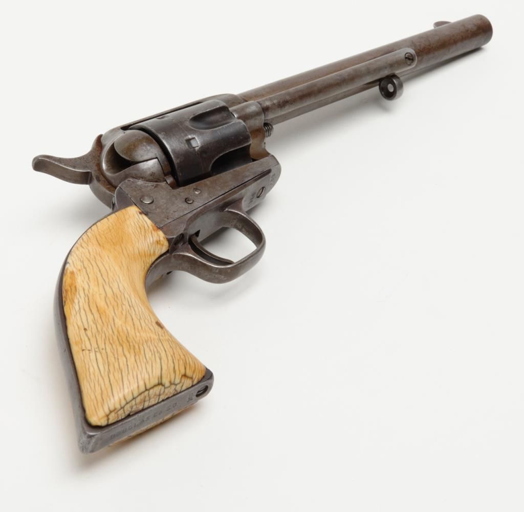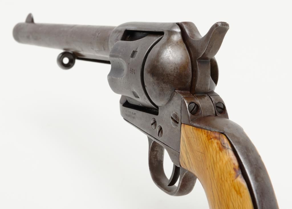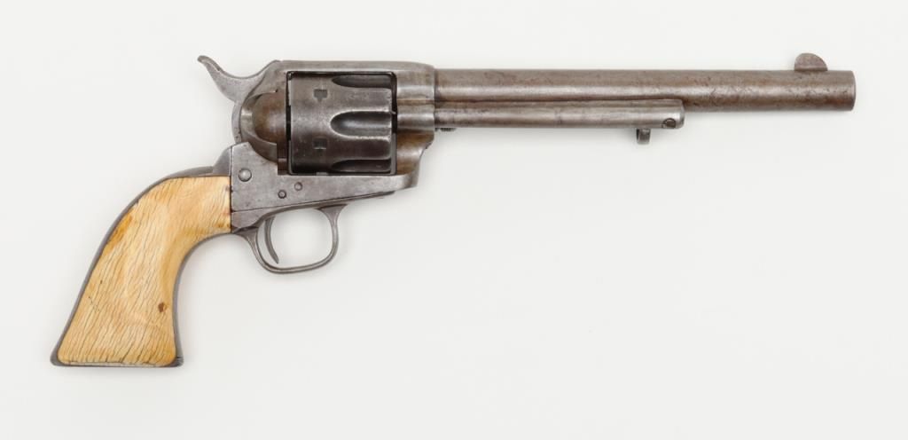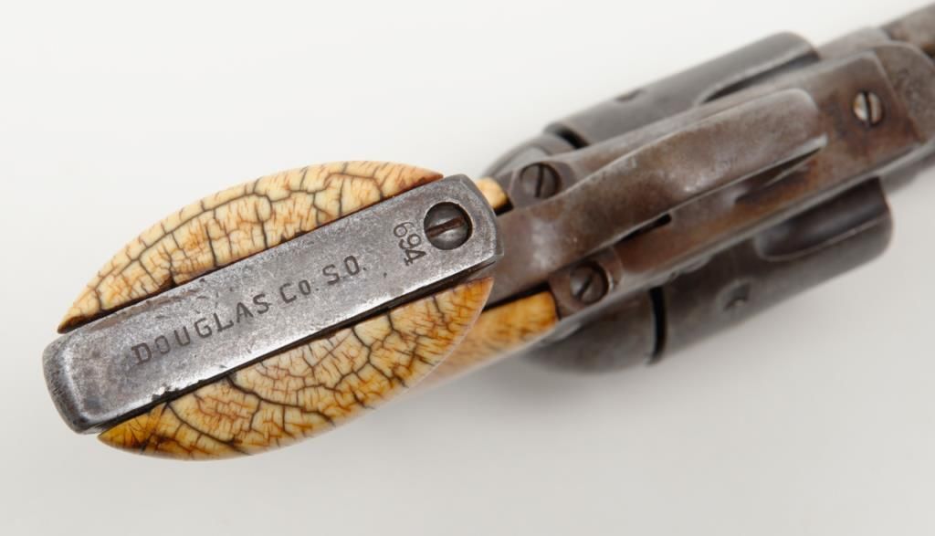 Colt SAA revolver, .44RF cal., 7-1/2” barrel, blue finish, ivory grips, #694 with “DOUGLAS Co. S.O.” stamped on bottom of butt strap and accompanied by a double loop tooled leather Olive brand holster and cartridge belt. This gun is in overall very good condition showing a dark patina to metal surfaces, very good + bore with crisp action, sharp markings including italicized barrel address, matching visible numbers, beautiful mellow period ivory grips with characteristic agecracklature. Accompanied by a factory letter confirming caliber, barrel length and finish with type of stocks “Not Listed”, shipped to Meyer and Geiger, Omaha, Nebraska on June 28, 1876 in a group of 50 similar guns. The stamped inscription appears definitely period and there is a Douglas County located in Nebraska where Omaha is the County seat; holster and belt are well-worn but good overall with several cartridges that have been in the rig for many years. From a respectedcollection that was begun by collector’s father in the early 1900’s. (Antique). Est.: $13,000-$26,000.