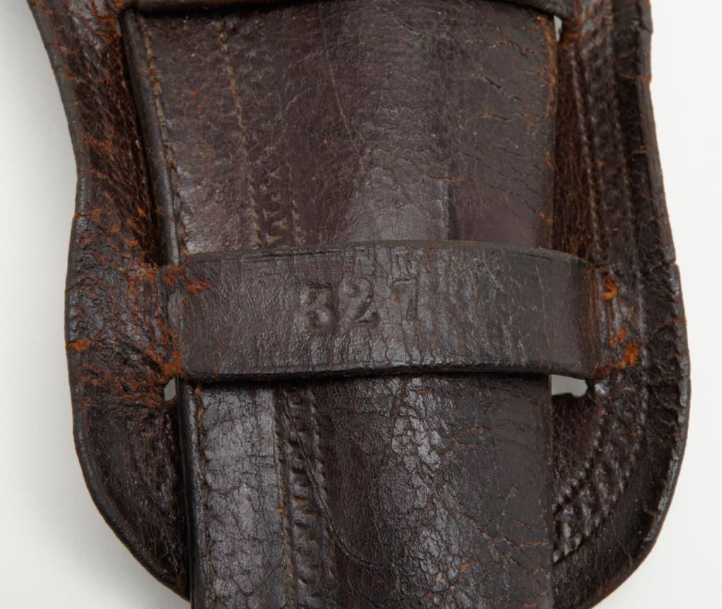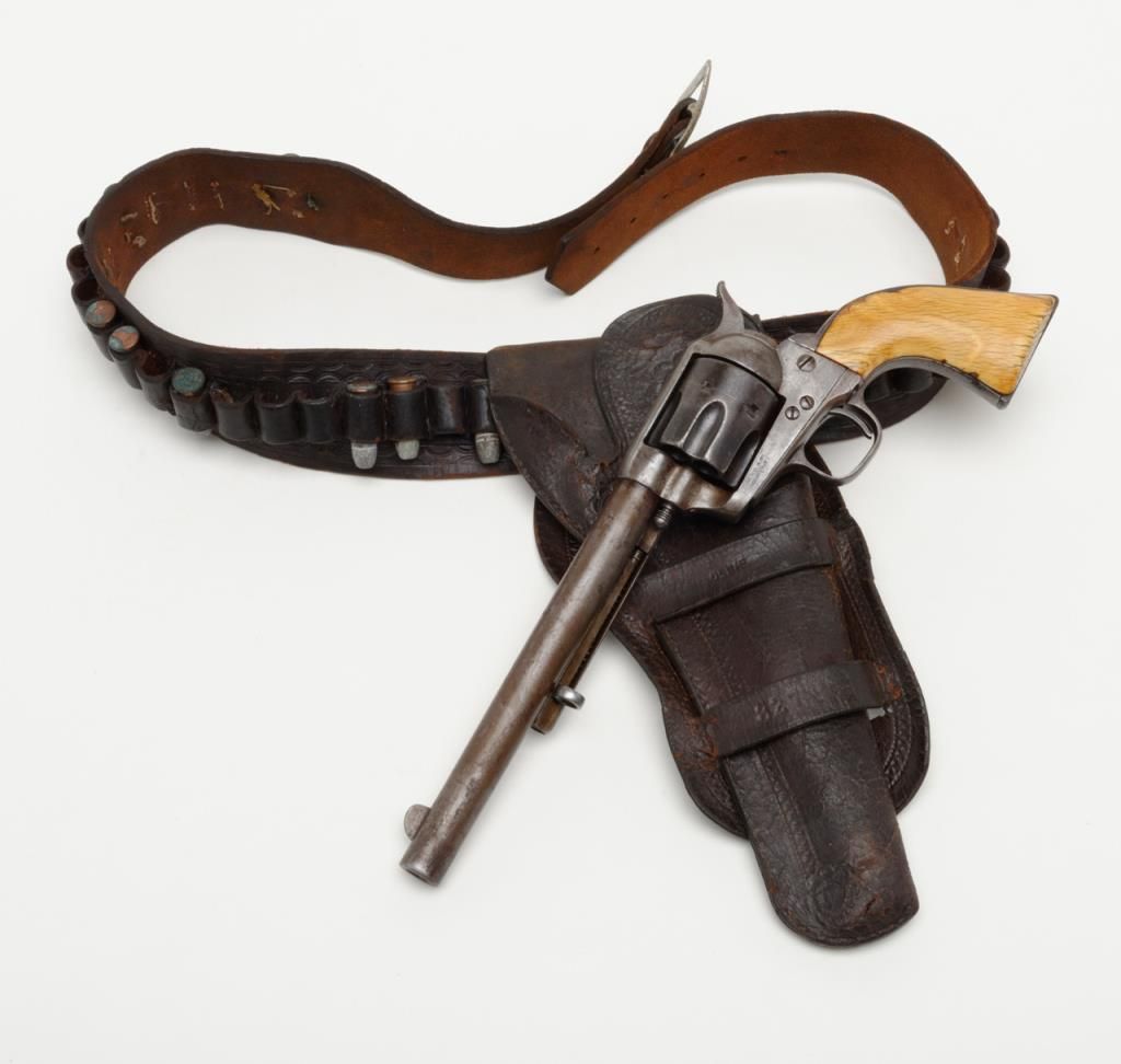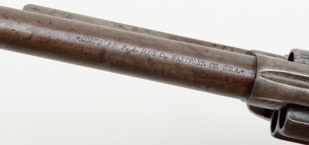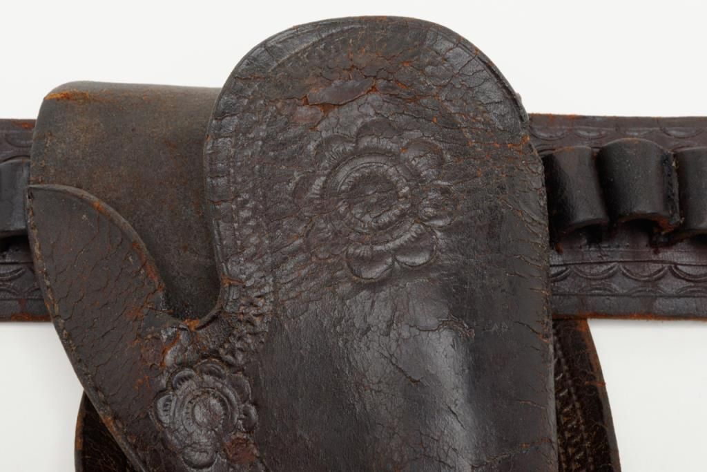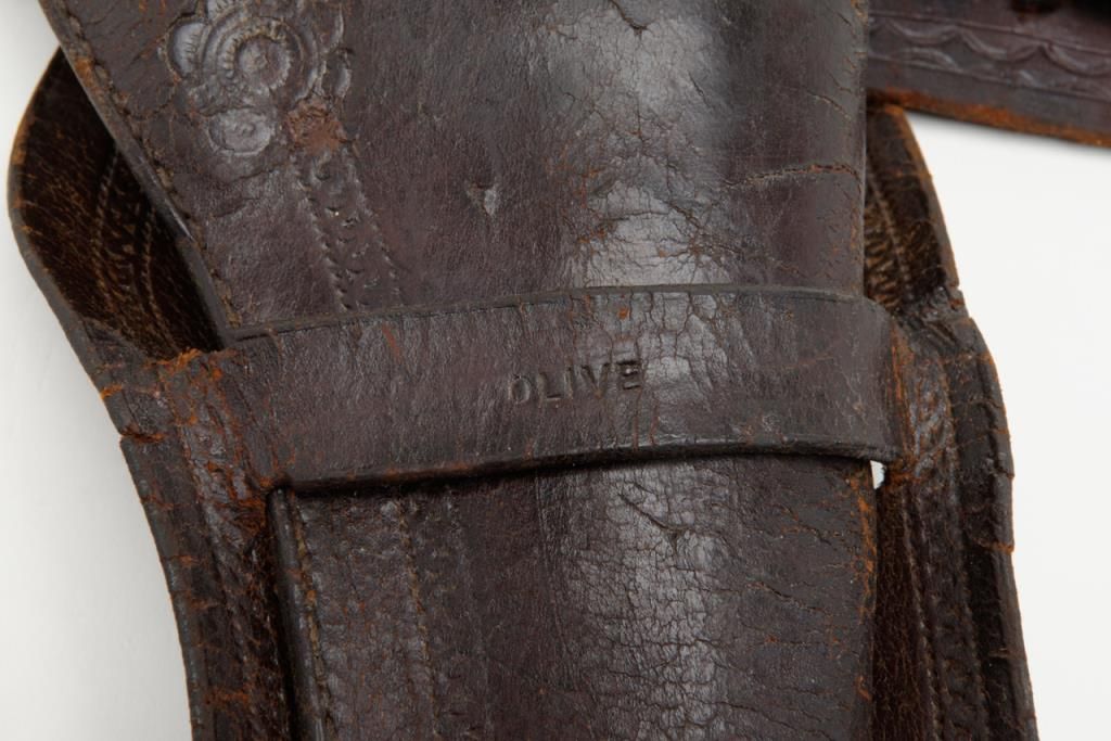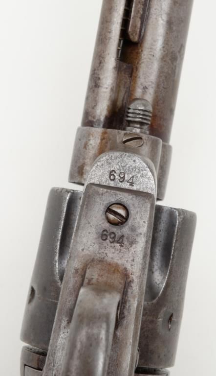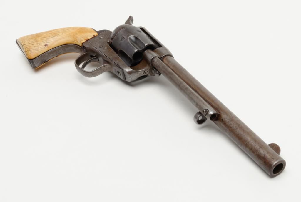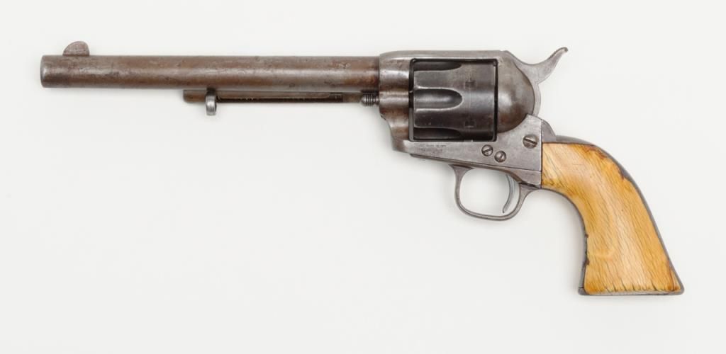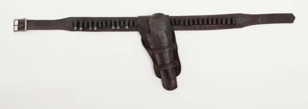 Colt SAA revolver, .44RF cal., 7-1/2” barrel, blue finish, ivory grips, #694 with “DOUGLAS Co. S.O.” stamped on bottom of butt strap and accompanied by a double loop tooled leather Olive brand holster and cartridge belt. This gun is in overall very good condition showing a dark patina to metal surfaces, very good + bore with crisp action, sharp markings including italicized barrel address, matching visible numbers, beautiful mellow period ivory grips with characteristic agecracklature. Accompanied by a factory letter confirming caliber, barrel length and finish with type of stocks “Not Listed”, shipped to Meyer and Geiger, Omaha, Nebraska on June 28, 1876 in a group of 50 similar guns. The stamped inscription appears definitely period and there is a Douglas County located in Nebraska where Omaha is the County seat; holster and belt are well-worn but good overall with several cartridges that have been in the rig for many years. From a respectedcollection that was begun by collector’s father in the early 1900’s. (Antique). Est.: $13,000-$26,000.