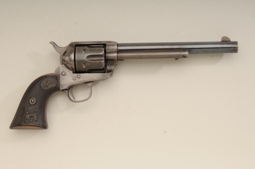 Colt SAA revolver, .45 Colt cal., 7-1/2” barrel, blue and case hardened finish, checkered black hard rubber eagle grips, #97041. This gun is in overall very good condition showing considerable original blueon the barrel and traces of case hardening in the protected areas of the frame; crisp action, good bore, sharp markings and overall good grips showing even wear and good fit; cylinder pin is a later replacement. Est.:$1,750-$3,500.