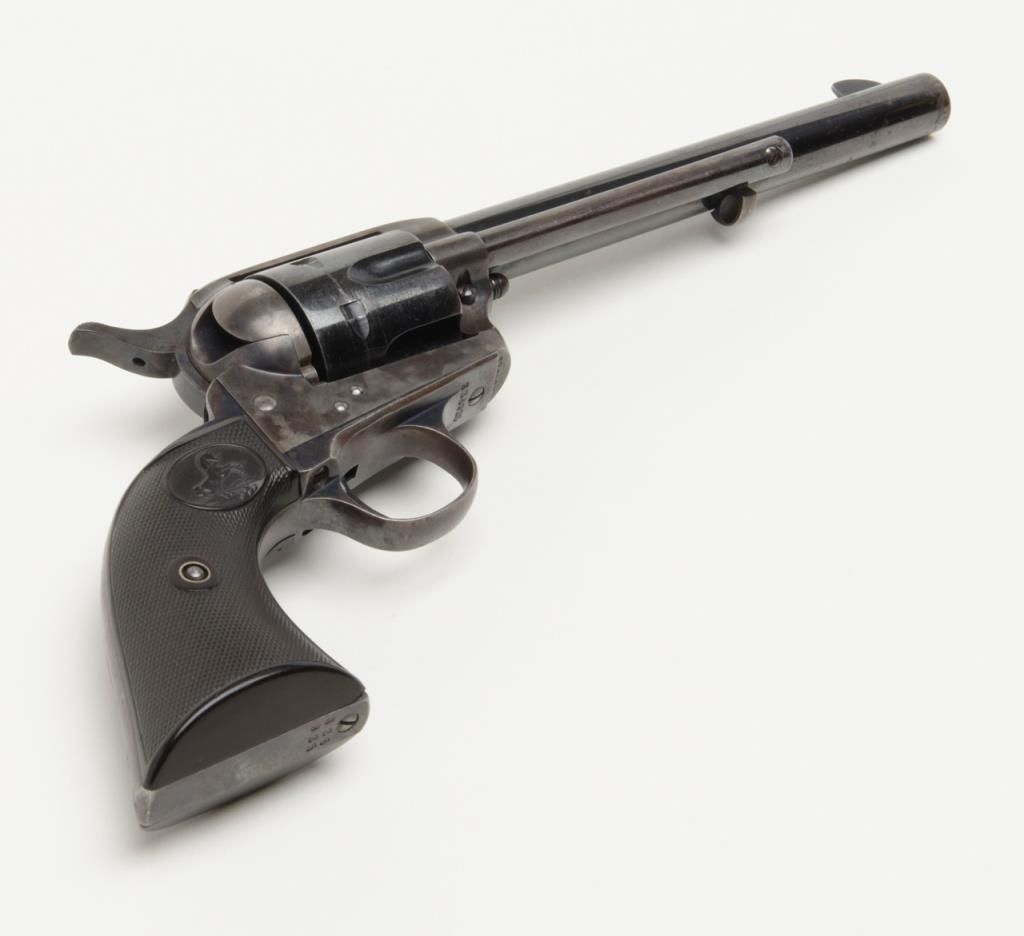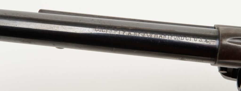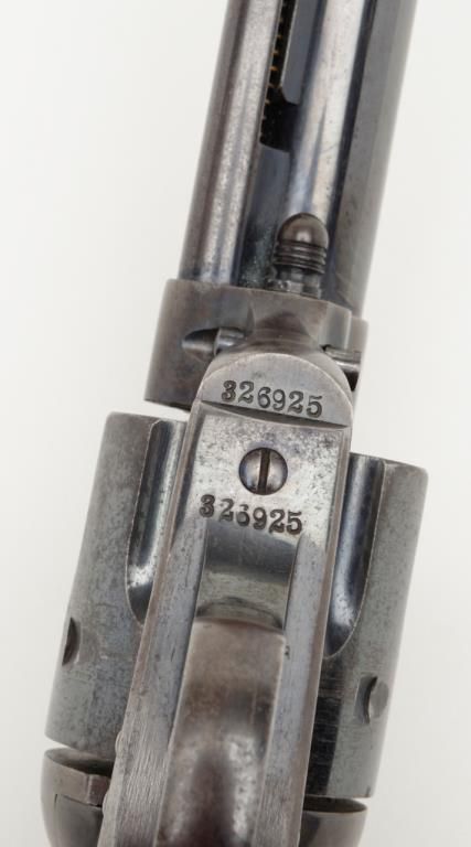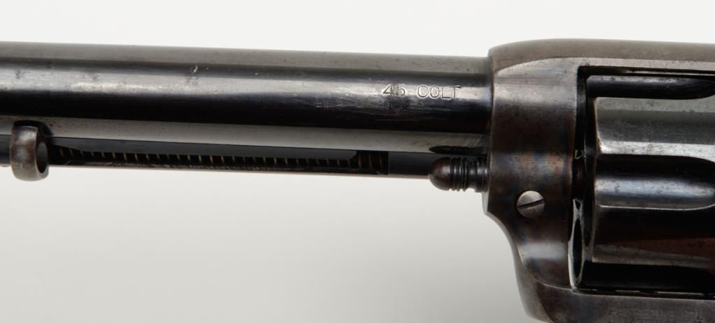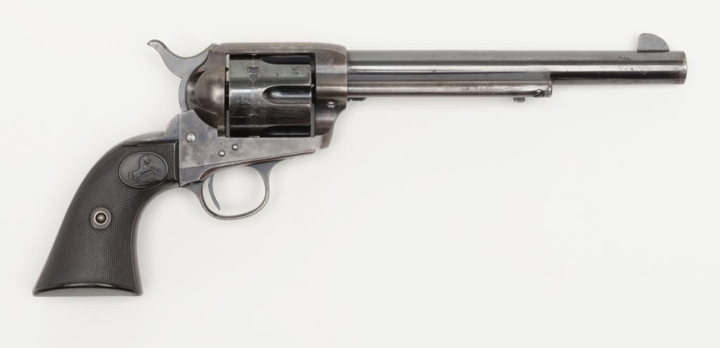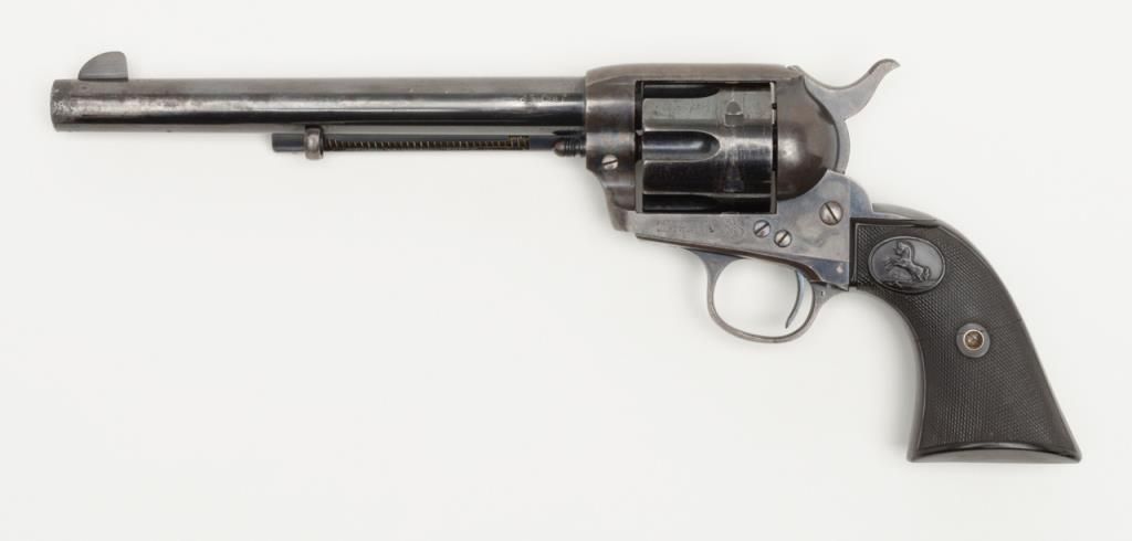 Colt SAA revolver, .45 Colt cal., 7-1/2” barrel, blue and case hardened finish, checkered hard rubber grips, #326925 in overall fine condition showing the majority of its original blue finish with some spots of erosion and majority of itsmuted case colors on frame and hammer; fine bore, crisp action, sharp markings and fine grips; no factory letter but consignor indicates Colt advises gun was shipped to Montgomery Ward. (C&R). Est.: $3,500-$7,000.