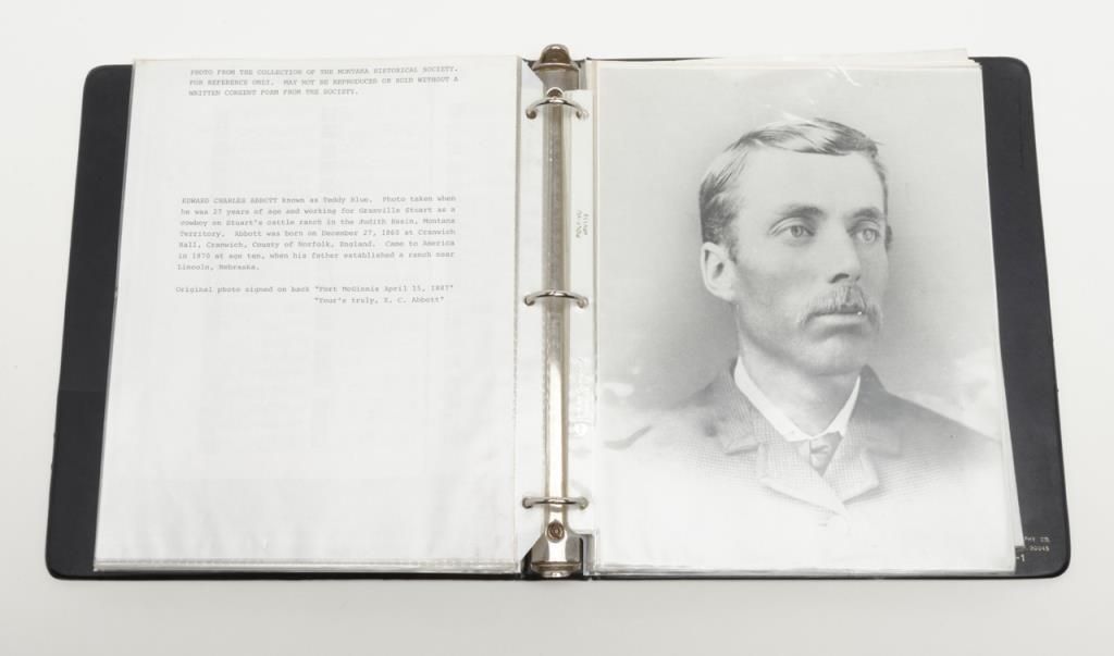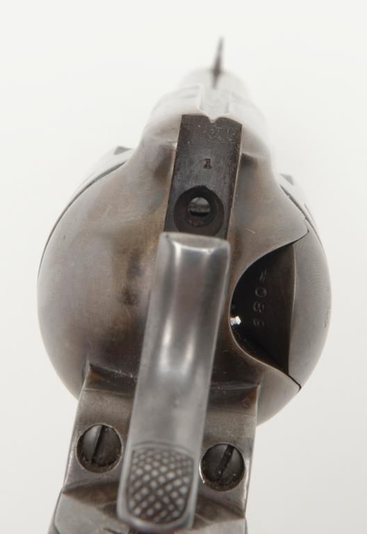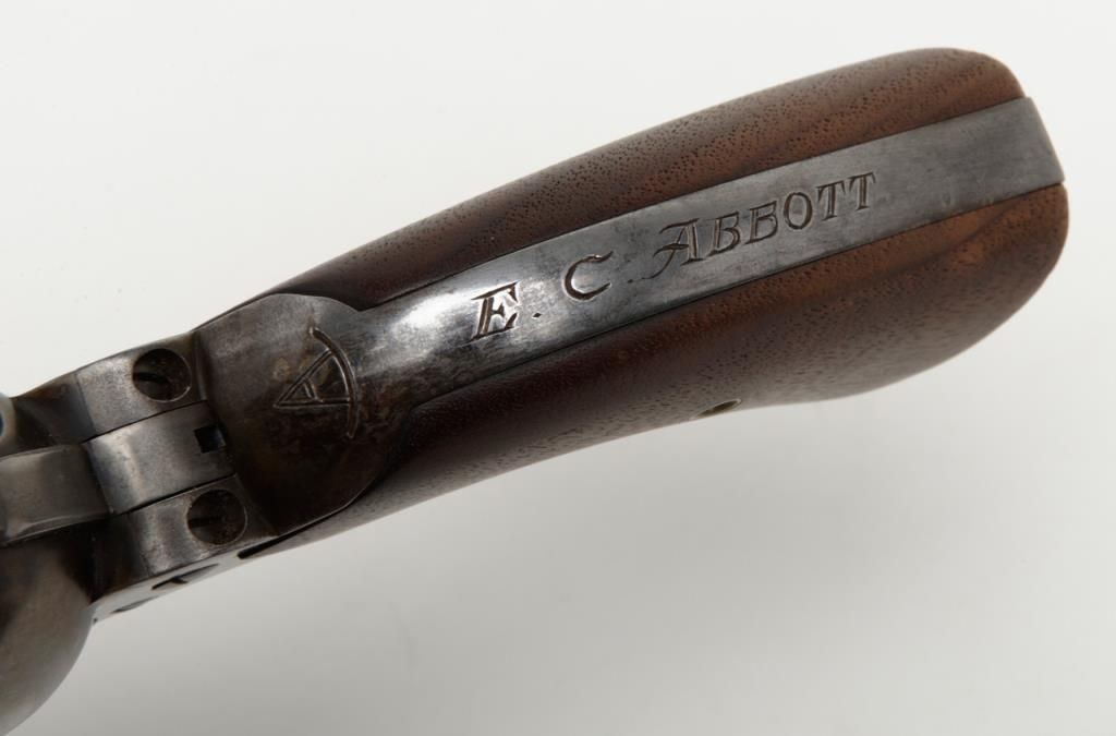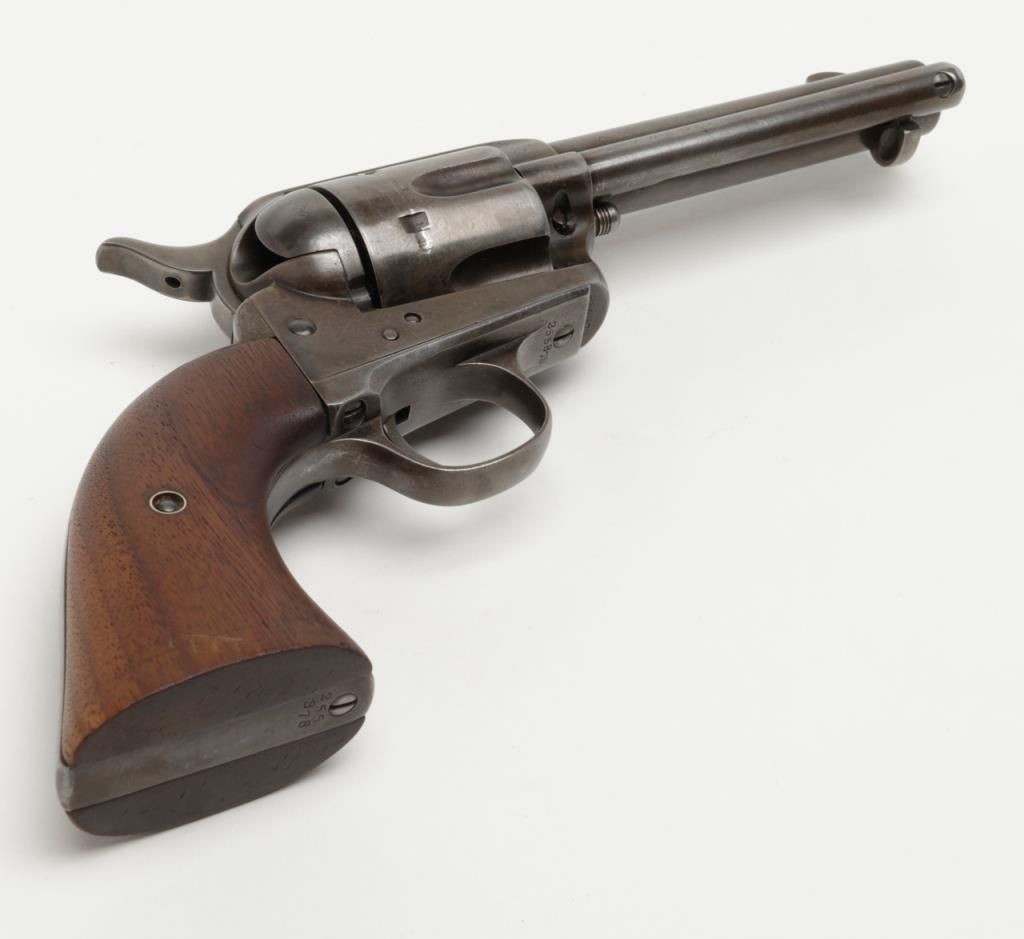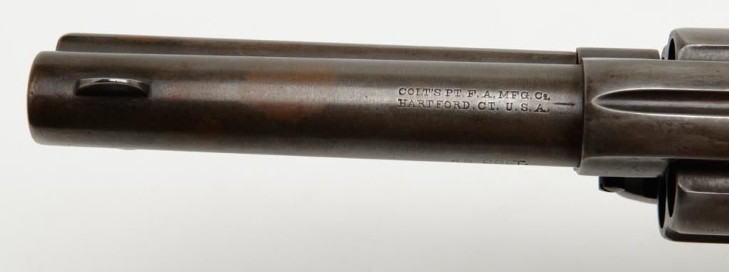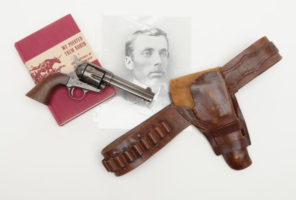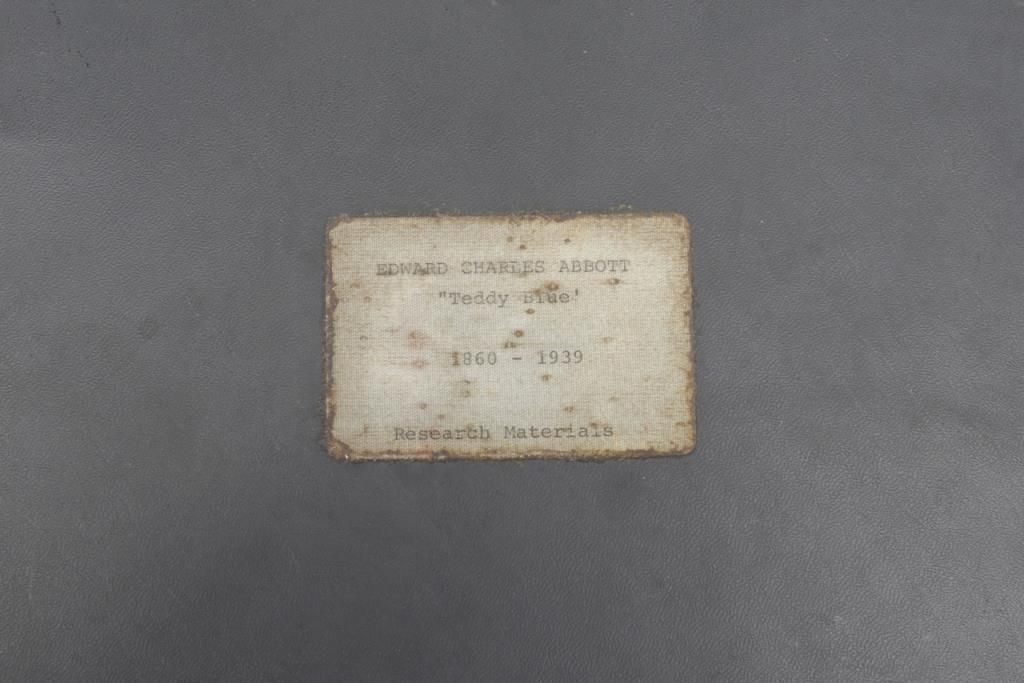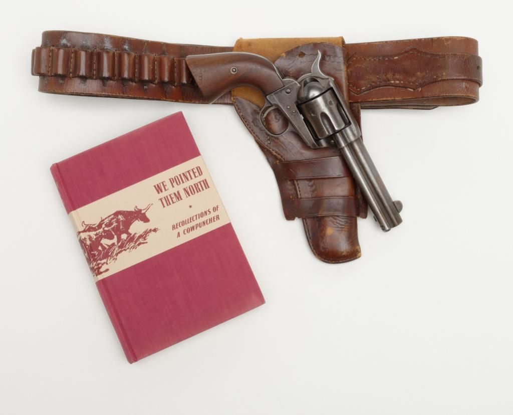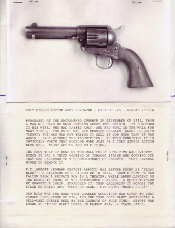 Colt SAA revolver, .45 cal., 4-3/4” barrel, blue finish, replaced smooth wood grips, #255878, backstrap inscribed “E C Abbott” and an inscribed “Rocking A” brand on top of the backstrap behind the trigger; accompanied with a double loopleather loop holster, a heavy leather cartridge belt (both un-marked), a 3-ring binder of information and letters related to research on this gun and E C “Teddy Blue” Abbott, a well-known Western cowboy and son-in-law of legendaryMontana rancher, statesman and head of the Vigilantes, Granville Stuart; also a signed 1939 hardback edition of “We Pointed Them North” by E.C. Abbott and Helena Huntington Smith. The gun is in overall good to very good condition showingmixed blue in protected areas and grey patina with scattered light pinprick surface pitting, crisp action, very good markings, matching visible serial numbers, good bore and very good grips. File includes a 1982 Colt factory letterconfirming caliber, barrel length and finish with shipment to A. Baldwin c/o Stauffer Eshleman Co., New Orleans, LA on July 19, 1904, 6 guns in shipment. This gun has been known to Little John’s since its sale at one of our earlier