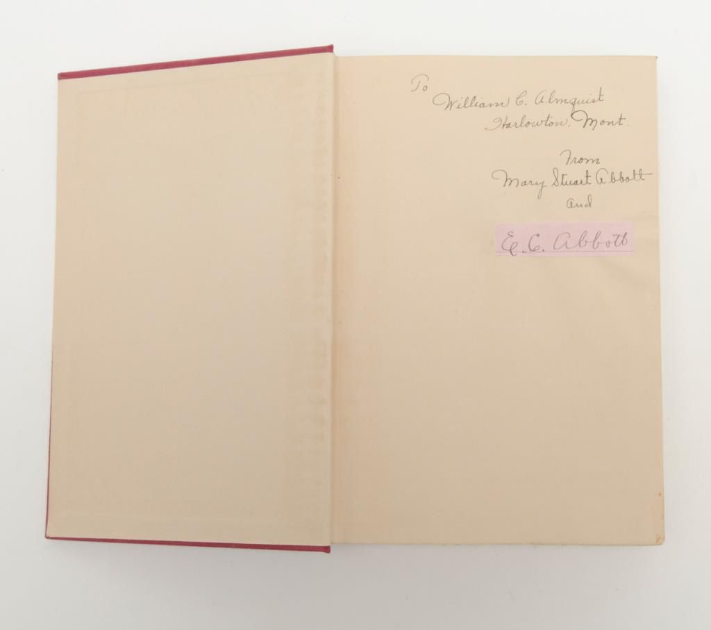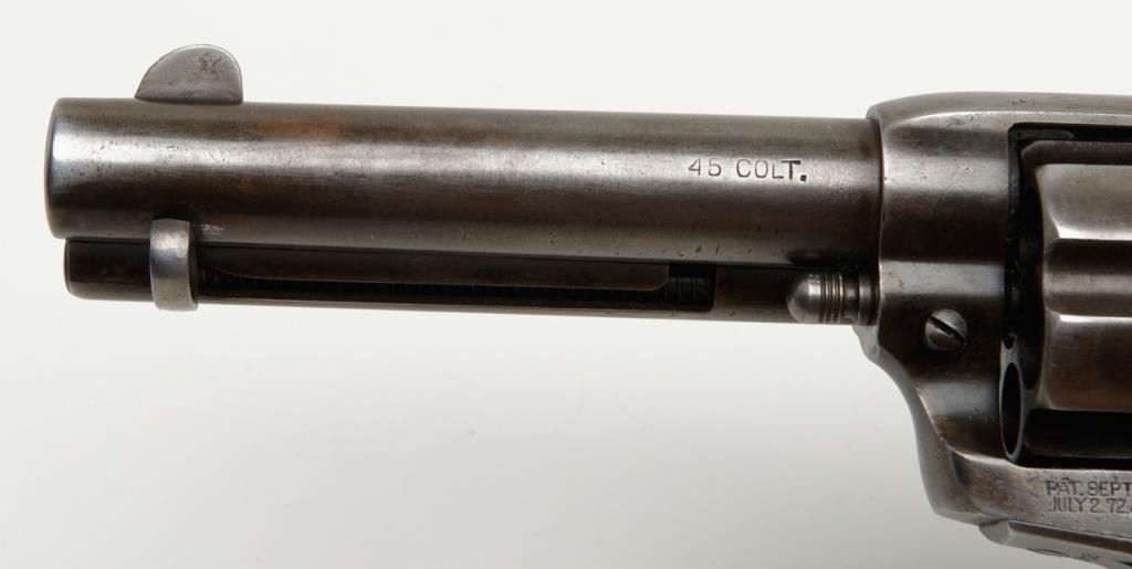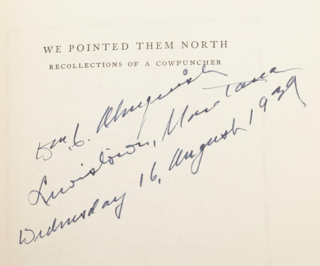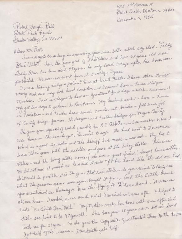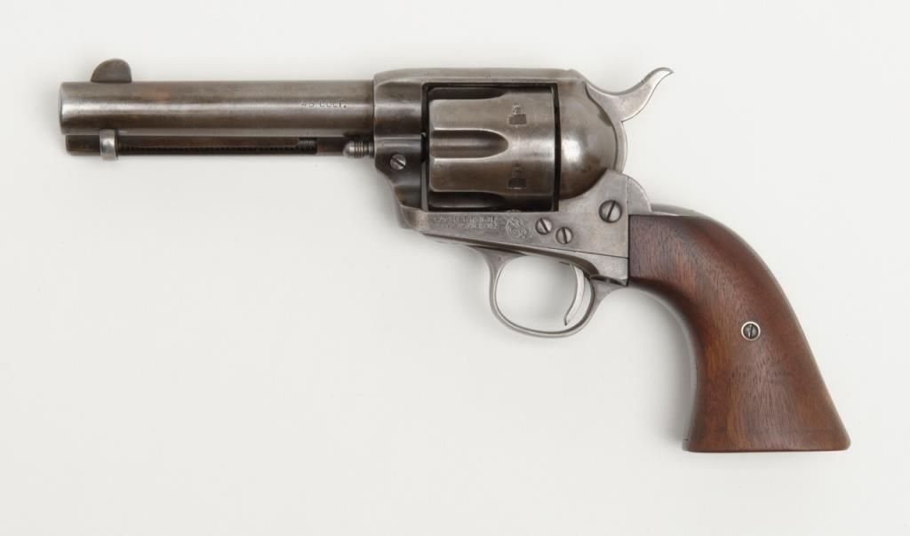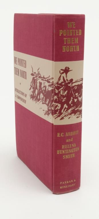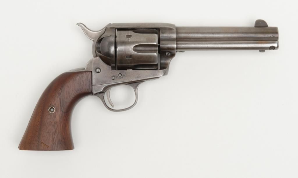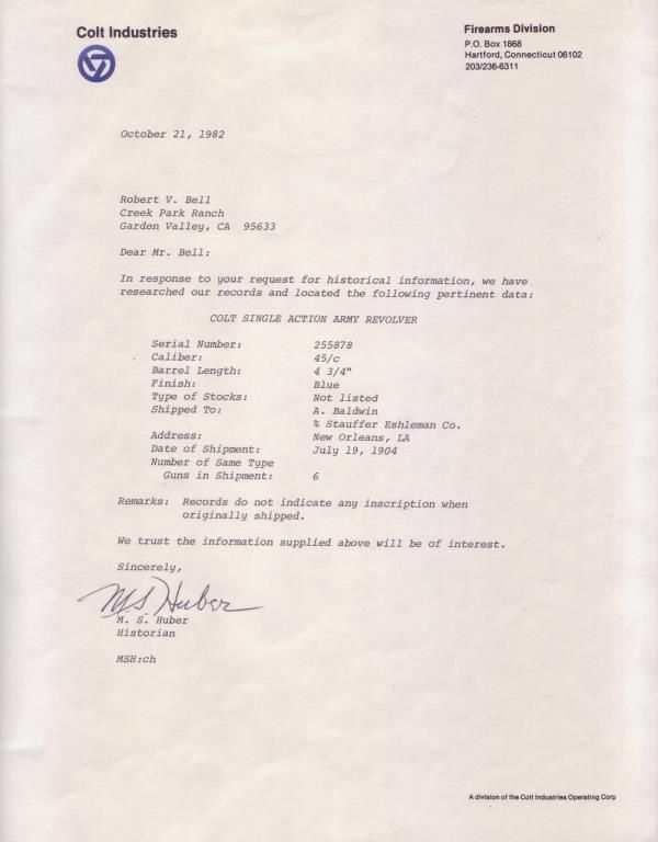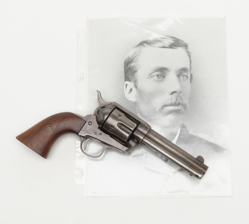 Colt SAA revolver, .45 cal., 4-3/4” barrel, blue finish, replaced smooth wood grips, #255878, backstrap inscribed “E C Abbott” and an inscribed “Rocking A” brand on top of the backstrap behind the trigger; accompanied with a double loopleather loop holster, a heavy leather cartridge belt (both un-marked), a 3-ring binder of information and letters related to research on this gun and E C “Teddy Blue” Abbott, a well-known Western cowboy and son-in-law of legendaryMontana rancher, statesman and head of the Vigilantes, Granville Stuart; also a signed 1939 hardback edition of “We Pointed Them North” by E.C. Abbott and Helena Huntington Smith. The gun is in overall good to very good condition showingmixed blue in protected areas and grey patina with scattered light pinprick surface pitting, crisp action, very good markings, matching visible serial numbers, good bore and very good grips. File includes a 1982 Colt factory letterconfirming caliber, barrel length and finish with shipment to A. Baldwin c/o Stauffer Eshleman Co., New Orleans, LA on July 19, 1904, 6 guns in shipment. This gun has been known to Little John’s since its sale at one of our earlier