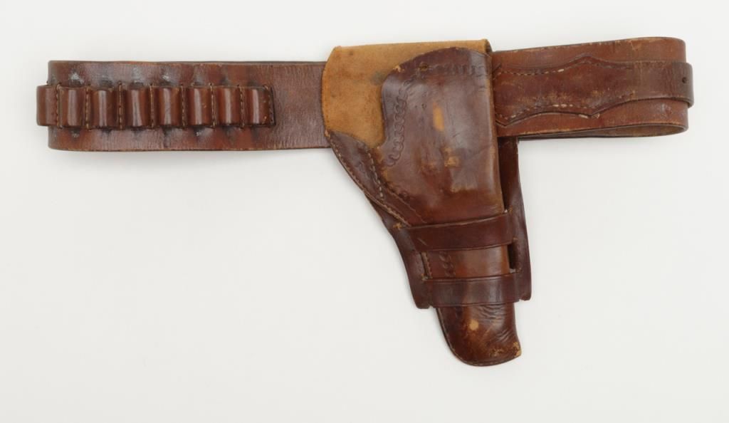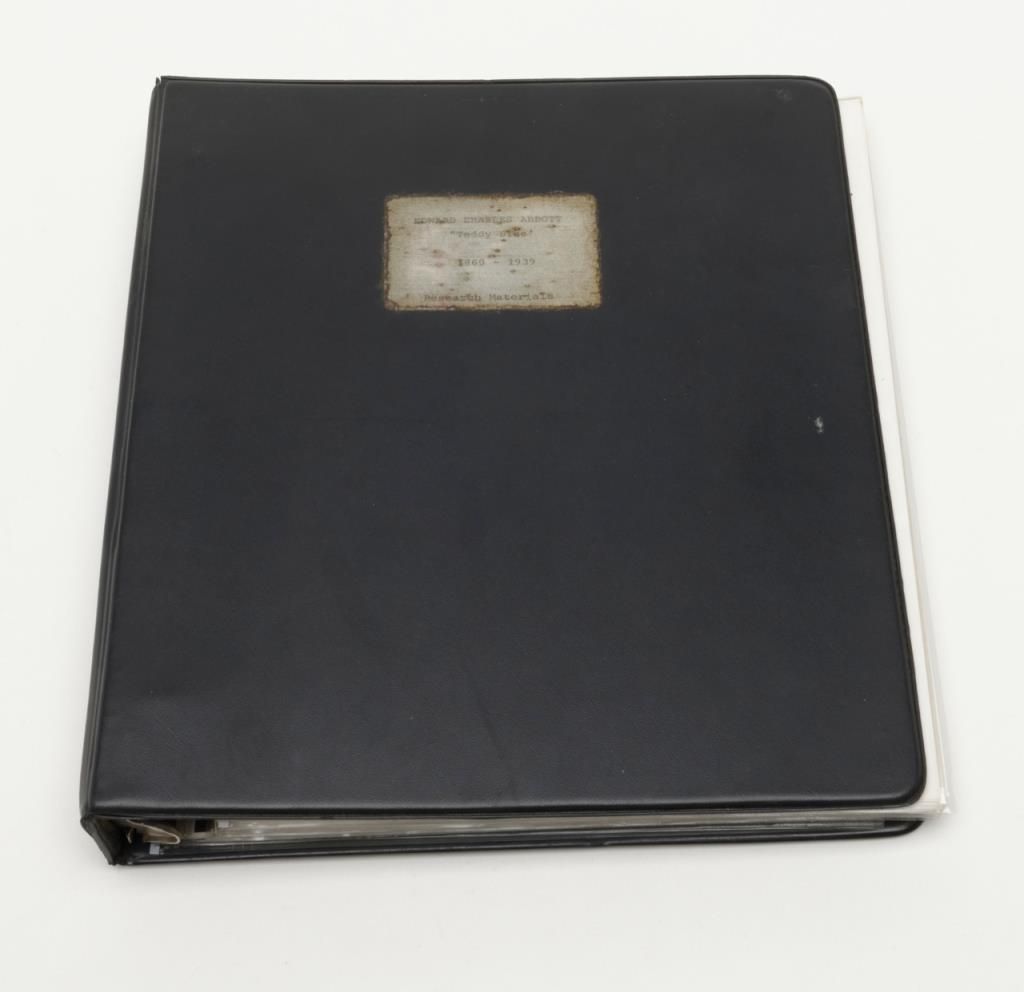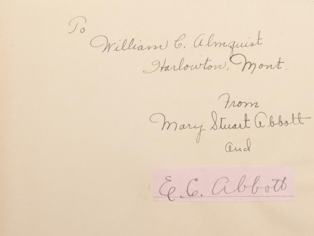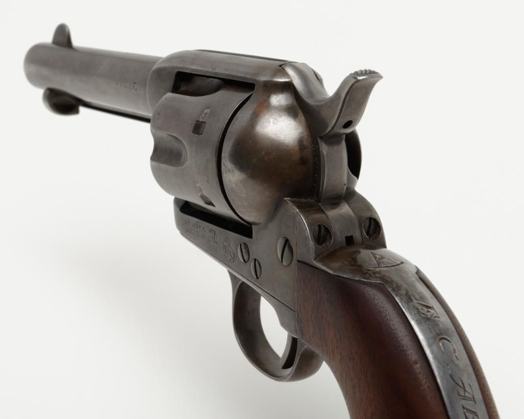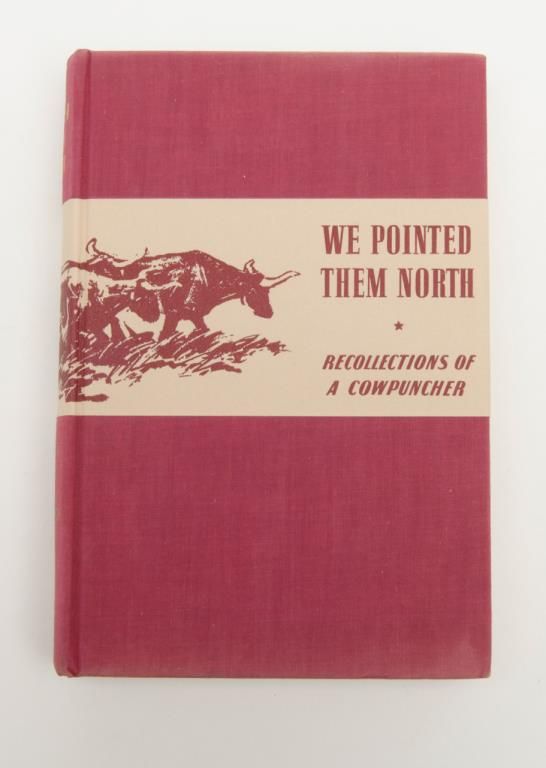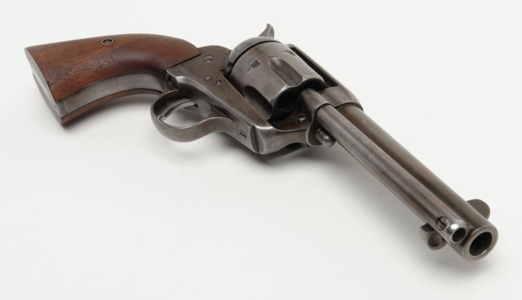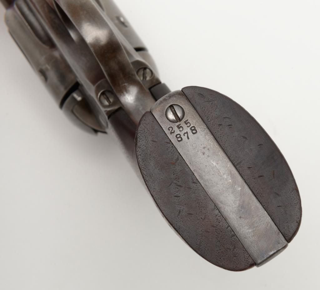 Colt SAA revolver, .45 cal., 4-3/4” barrel, blue finish, replaced smooth wood grips, #255878, backstrap inscribed “E C Abbott” and an inscribed “Rocking A” brand on top of the backstrap behind the trigger; accompanied with a double loopleather loop holster, a heavy leather cartridge belt (both un-marked), a 3-ring binder of information and letters related to research on this gun and E C “Teddy Blue” Abbott, a well-known Western cowboy and son-in-law of legendaryMontana rancher, statesman and head of the Vigilantes, Granville Stuart; also a signed 1939 hardback edition of “We Pointed Them North” by E.C. Abbott and Helena Huntington Smith. The gun is in overall good to very good condition showingmixed blue in protected areas and grey patina with scattered light pinprick surface pitting, crisp action, very good markings, matching visible serial numbers, good bore and very good grips. File includes a 1982 Colt factory letterconfirming caliber, barrel length and finish with shipment to A. Baldwin c/o Stauffer Eshleman Co., New Orleans, LA on July 19, 1904, 6 guns in shipment. This gun has been known to Little John’s since its sale at one of our earlier