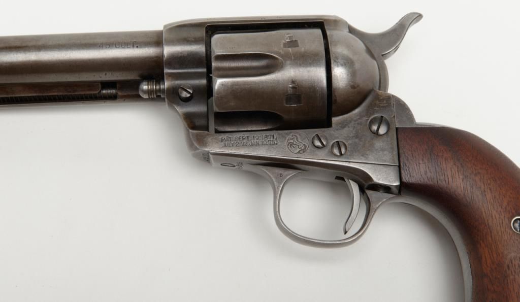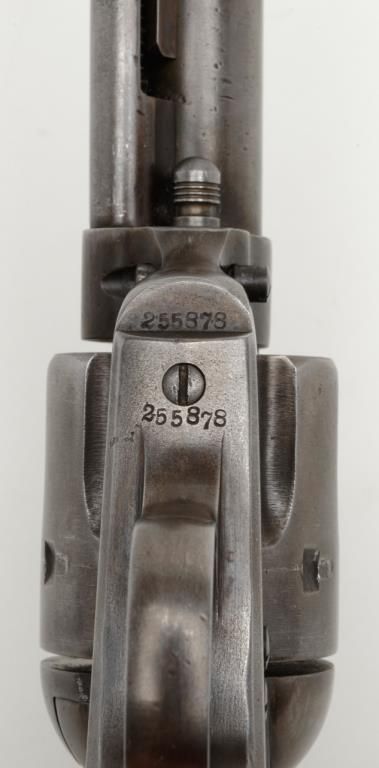 Colt SAA revolver, .45 cal., 4-3/4” barrel, blue finish, replaced smooth wood grips, #255878, back