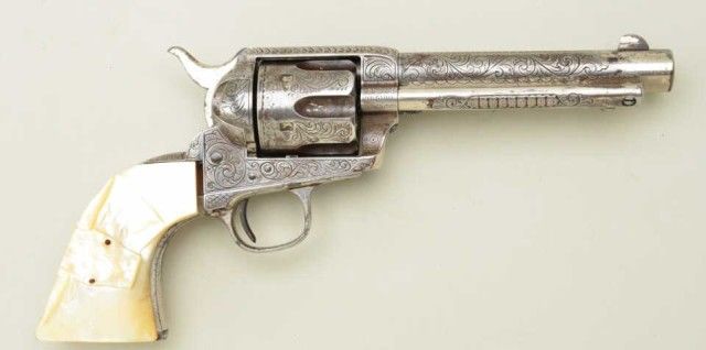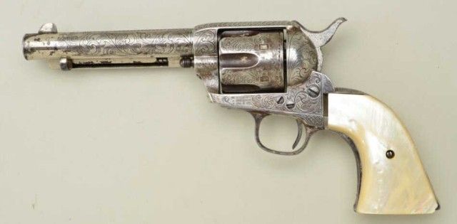 Colt SAA revolver, .45 cal., 5-1/2” barrel, Western style fancy scroll engraving, beautiful raised carved old pearl grips, #83791. This gun is in overall good to very good condition showing approx. 40% nickelfinish, very good bore, strong action, all matching visible numbers, iridescent thick pearl grips with raised carved steerhead grips in overall very good condition with slight corner losses and the grips are notfitted to this particular single action but obviously made for a Colt SAA. Est.: $2,000-$4,000.