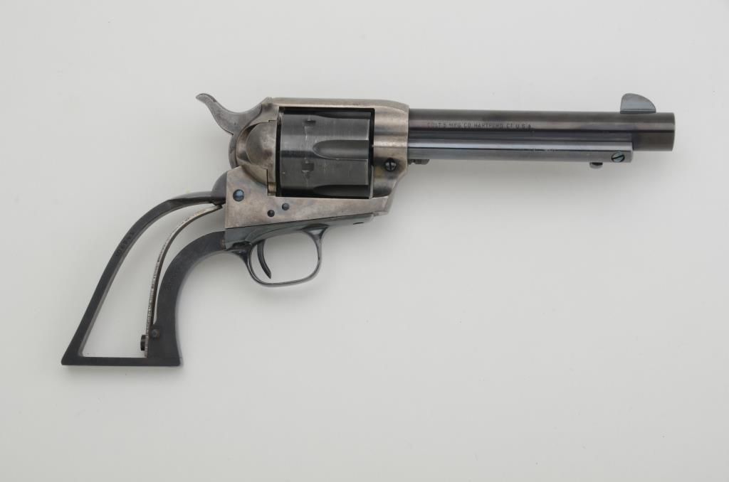Colt SAA revolver, .45 cal., 5-1/2” barrel, blue and case hardened finish, no grips, #348903. This gun is in overall fine condition showing the majority of its original blue finish and approx. 70% of itsoriginal case colors, bright bore, crisp action, sharp markings, several small mars on the barrel from storage; a nice First Generation that will improve greatly with a pair of original grips. Est.:$1,400-$2,800.