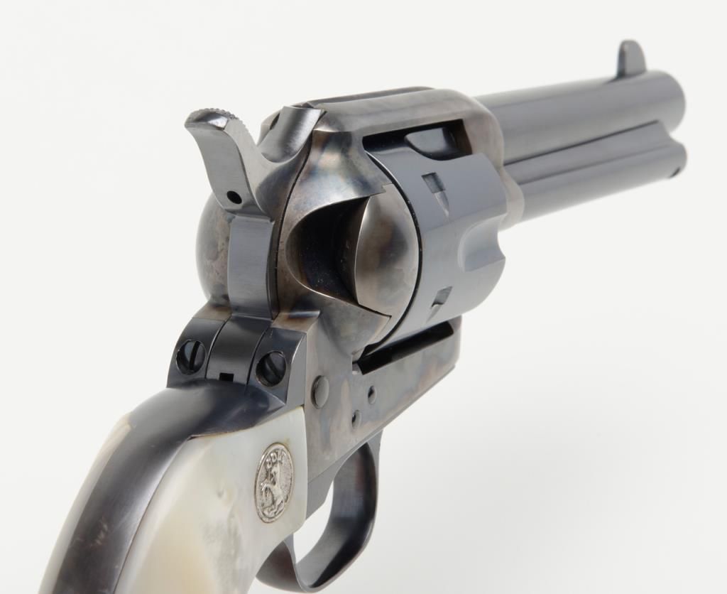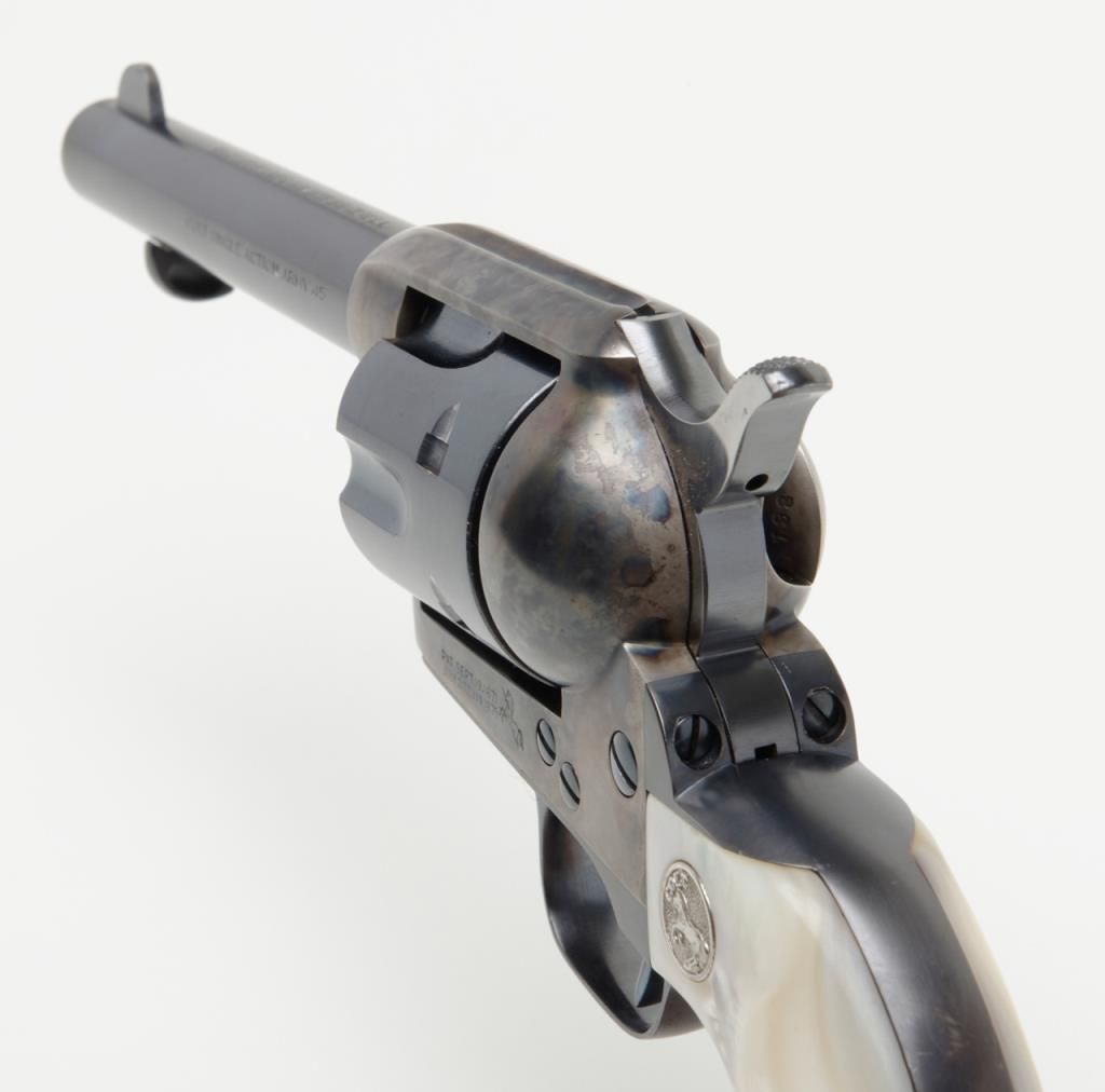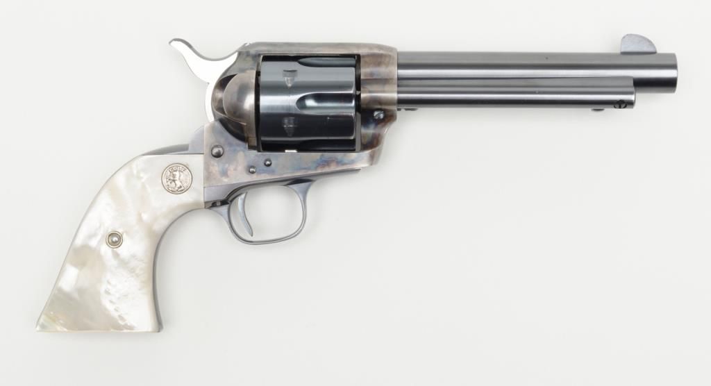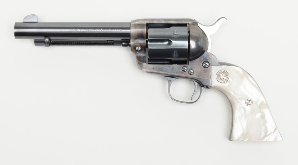 Colt SAA revolver, .45 cal., 5-1/2” barrel, blue and case hardened finish, pearl medallion grips, #355699 (circa 1937) in near mint condition showing the majority of its bright blue finish and vivid case colors; sharp markings, fine bore andaction, beautiful iridescent pearl grips with Colt medallions; a beautiful First Generation Single Action that would be hard to improve upon. (C&R). Est.: $6,000-$12,000.