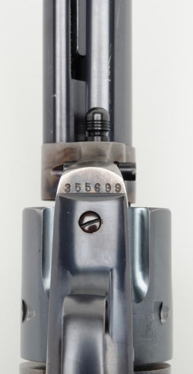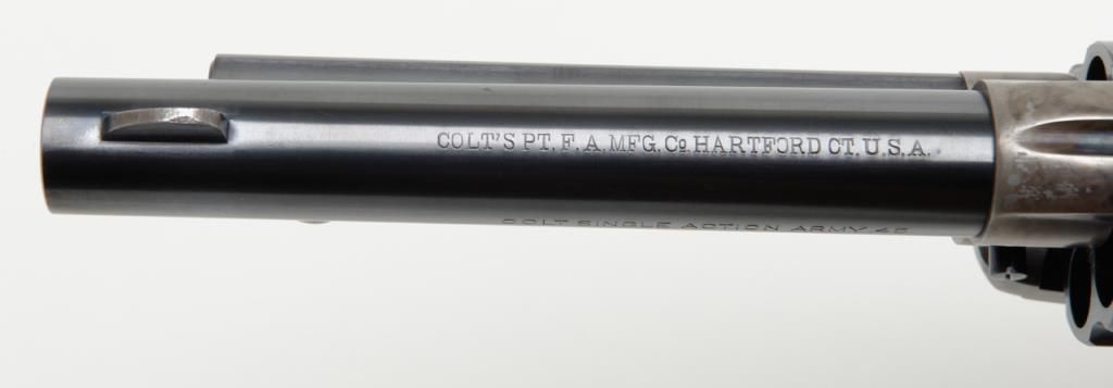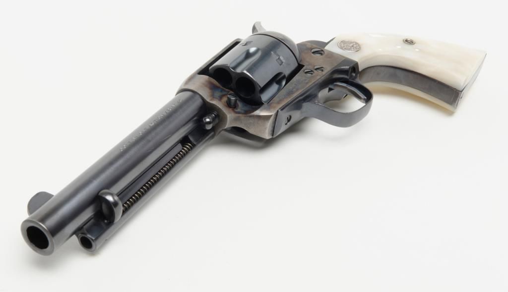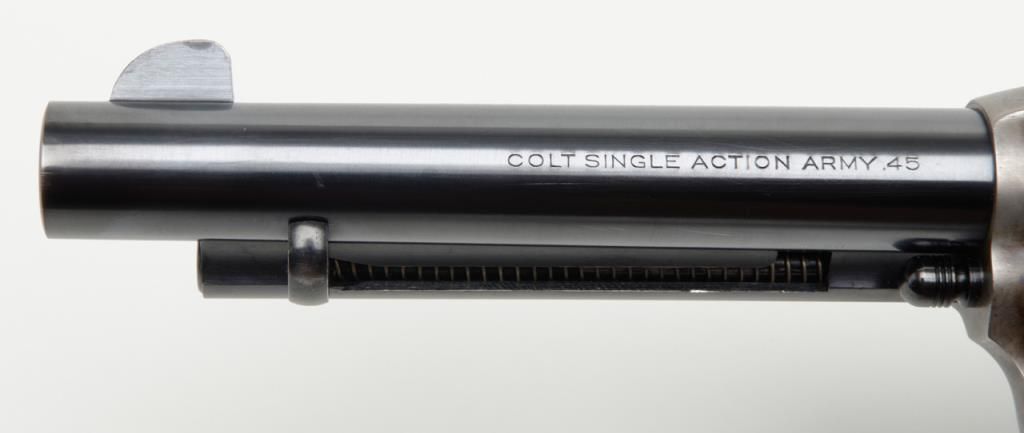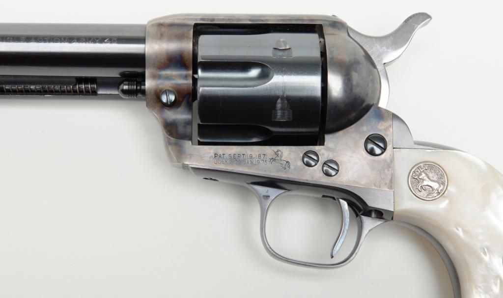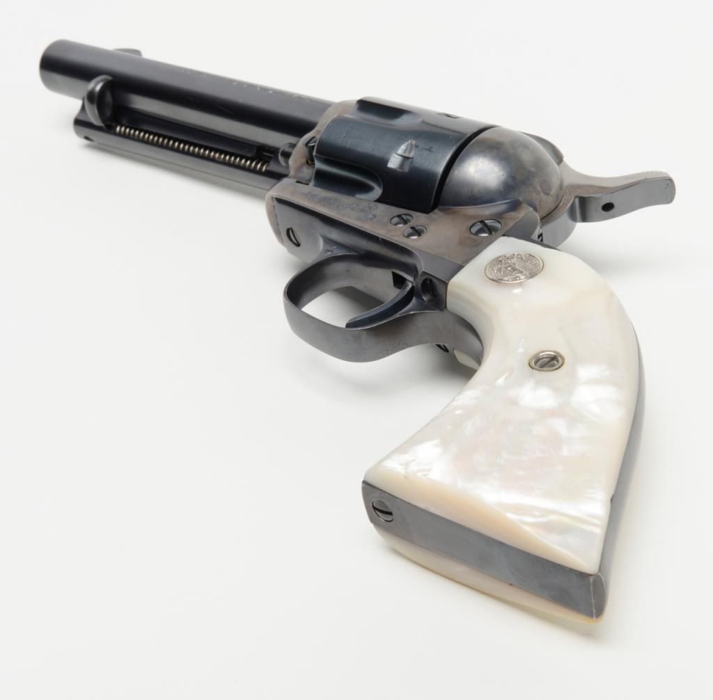 Colt SAA revolver, .45 cal., 5-1/2” barrel, blue and case hardened finish, pearl medallion grips, #355699 (circa 1937) in near mint condition showing the majority of its bright blue finish and vivid case colors; sharp markings, fine bore andaction, beautiful iridescent pearl grips with Colt medallions; a beautiful First Generation Single Action that would be hard to improve upon. (C&R). Est.: $6,000-$12,000.