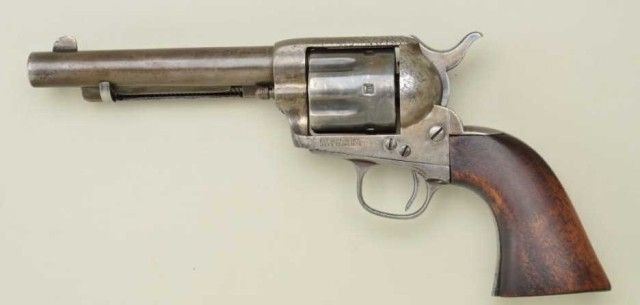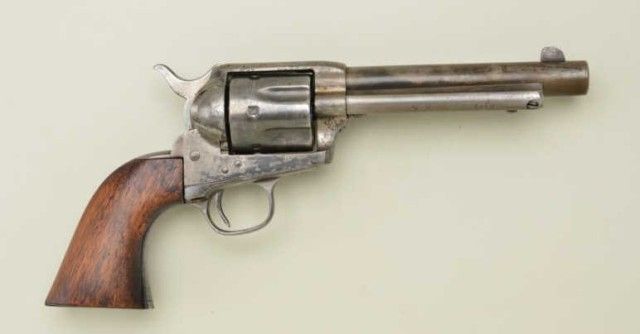 Colt SAA revolver, .45 cal., 5-1/2” barrel, blue and case hardened finish, replaced modern wood grips, #138800 on frame. This gun is in overall fair condition as reworked showing a “US” on the frame that may bespuriously added, trigger guard is #94842 with “G” inspection; re-stamped backstrap #98088; no visible numbers or inspection letters on barrel or cylinder, rough bore, fair to good action, mottled brown/bluepatina on metal surfaces; modern grips have been aged. Est.: $1,250-$1,850.